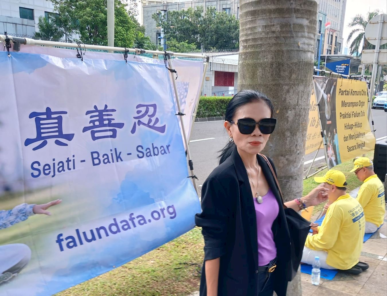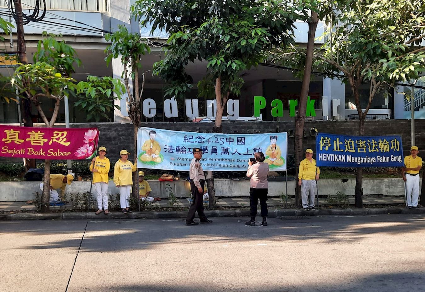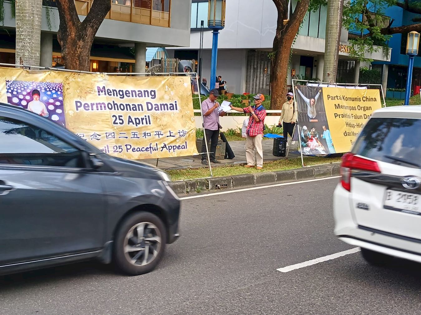 图1:二零二四年四月二十日,为纪念四·二五和平理性上访二十五周年,法轮功学员在印尼雅加达(Jakarta)的中国驻印尼大使馆前举办和平请愿活动。