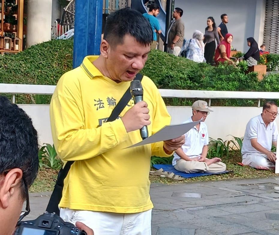 法轮功学员普利曼达喇(Primantara)阅读来自印尼佛学会的媒体公告:“全世界各国包括印尼的法轮功学员,已将参与迫害法轮功学员的犯有人道罪行的所有中共官员的名单递交给本国政府。各国已经实行相关制裁,如拒发签证、冻结犯有人道罪行的个人包括其家属的所有财产。”