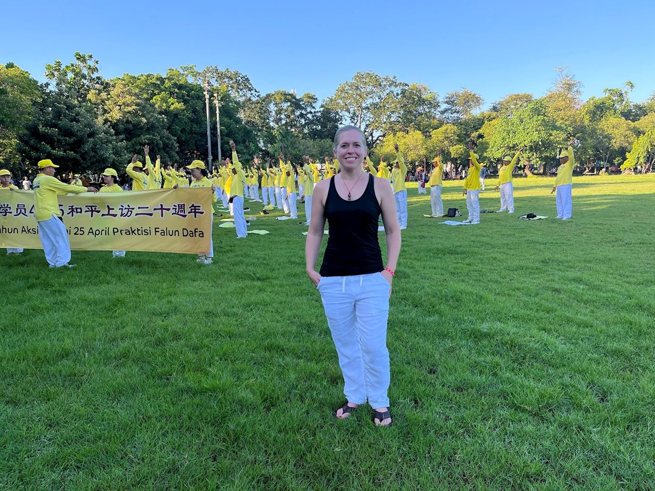 '图10:来自英国的女游客劳拉尔(Laura)第一次在峇里岛登巴沙(Denpasar)市学炼法轮功'