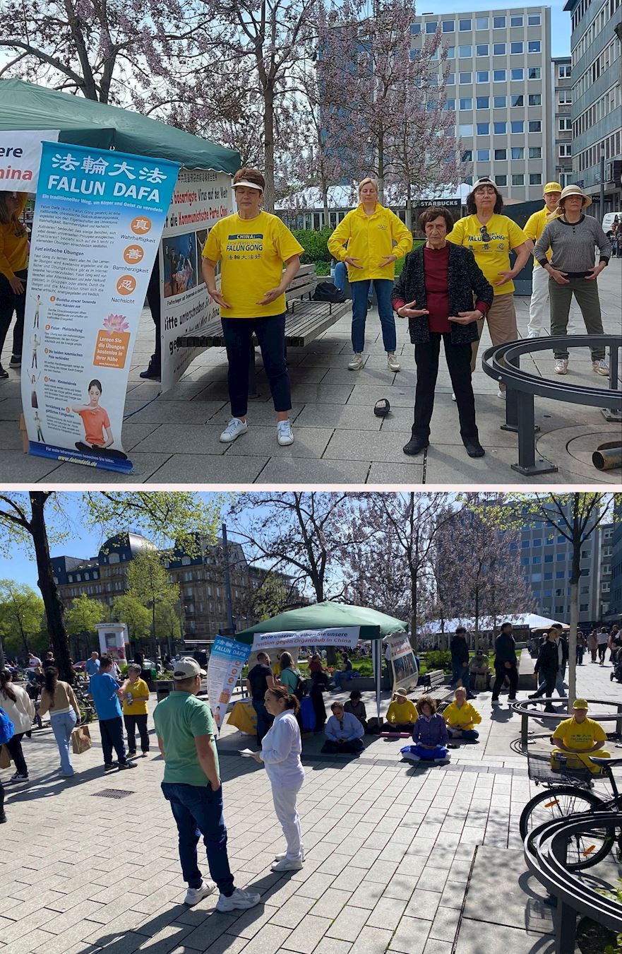 ![]() 图1:二零二四年四月六日及四月二十日,德国莱茵-内卡地区法轮功学员在曼海姆纪念“四·二五”和平上访二十五周年举办反迫害的活动。学员功法演示。 |