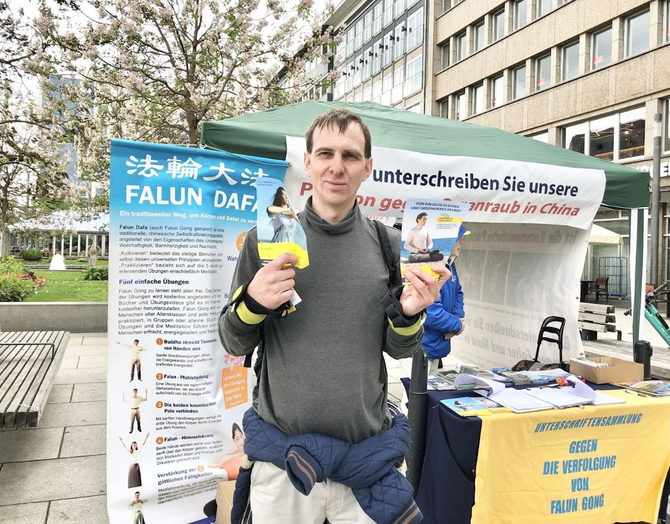 帕特里克·格伦塔尔(Patrick Grünthal)介绍自己来自柏林,目前在曼海姆大学学习。格伦塔尔说,“一开始看到你们,觉得像太极。后来一位学员告诉我,这个功法叫法轮大法。”