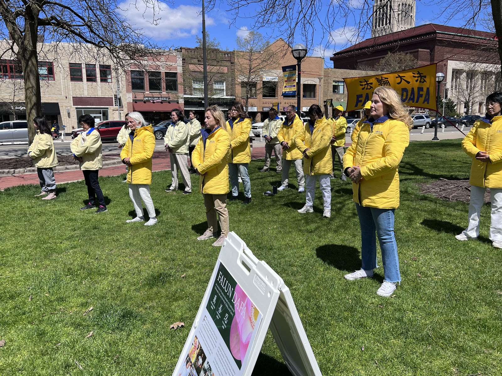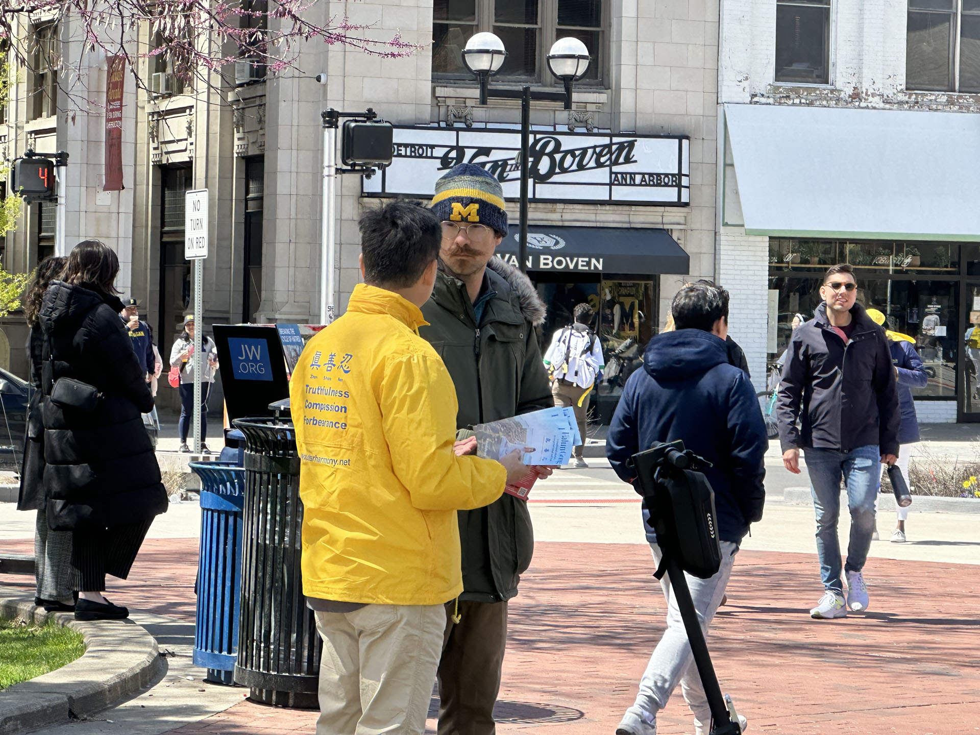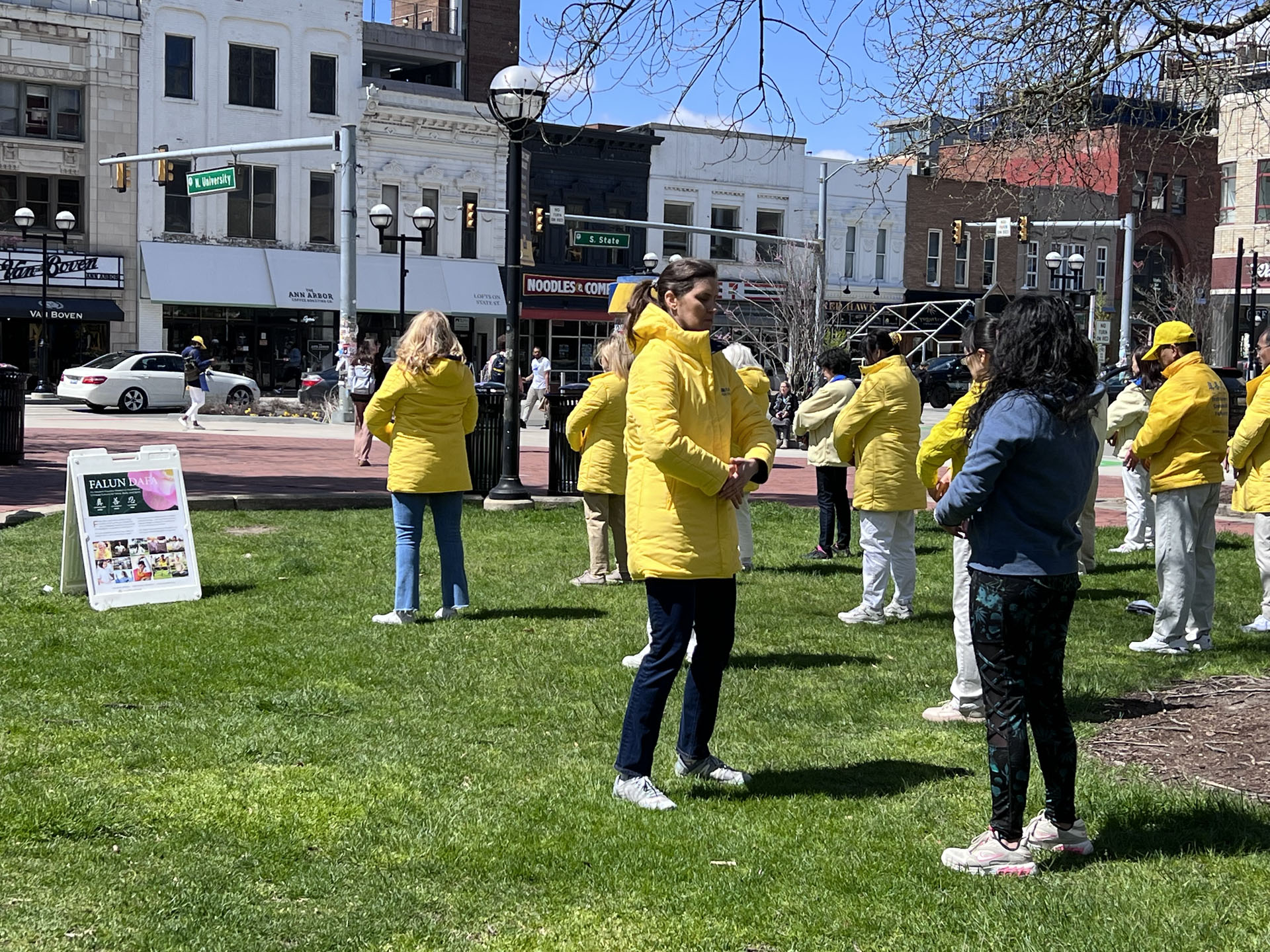 二零二四年四月二十一日,为纪念“四·二五”和平上访二十五周年,密西根大学安娜堡分校(University of Michigan - Ann Arbor)的校园中心,成为了密西根州法轮功学员们举行集体炼功、展示功法、讲真相的聚集之地。这一活动旨在纪念和回顾一九九九年北京和平上访事件,同时呼吁社会关注法轮功学员所遭受的迫害真相。