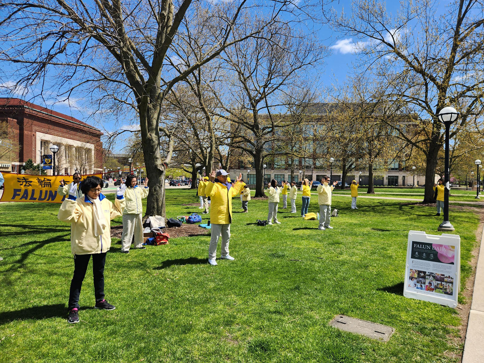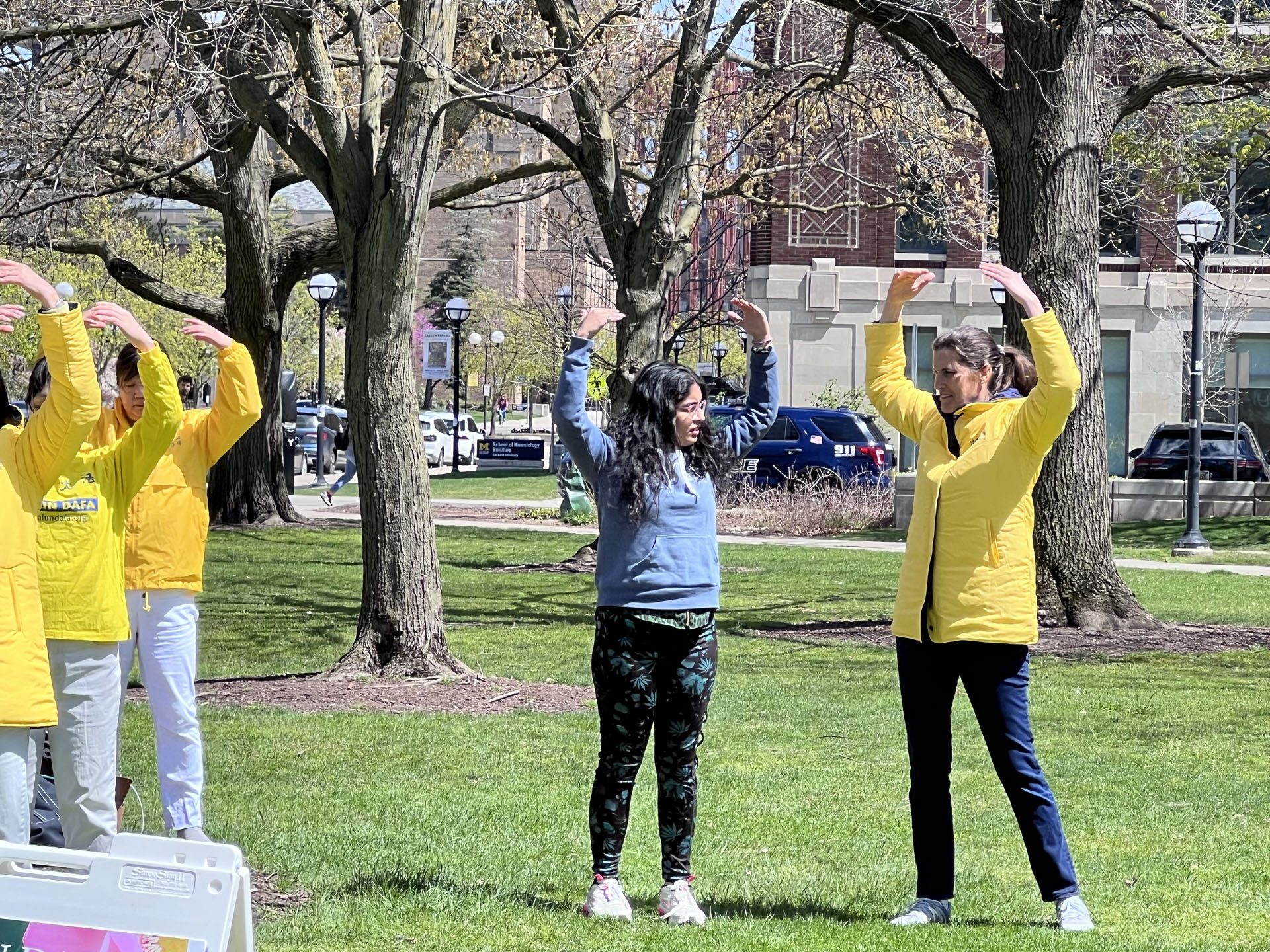由于近学期末,又是一年一度的毕业季临近,这座历史悠久的世界综合性研究型大学校园内,人群川流不息。活动当天,阳光明媚,地处美国中北部的密西根州仍是春寒料峭的时节,但依然挡不住师生和来准备参加毕业典礼的各地民众穿梭在校园内。法轮功学员展示的舒缓祥和的功法,自然而然地吸引了很多师生驻足。