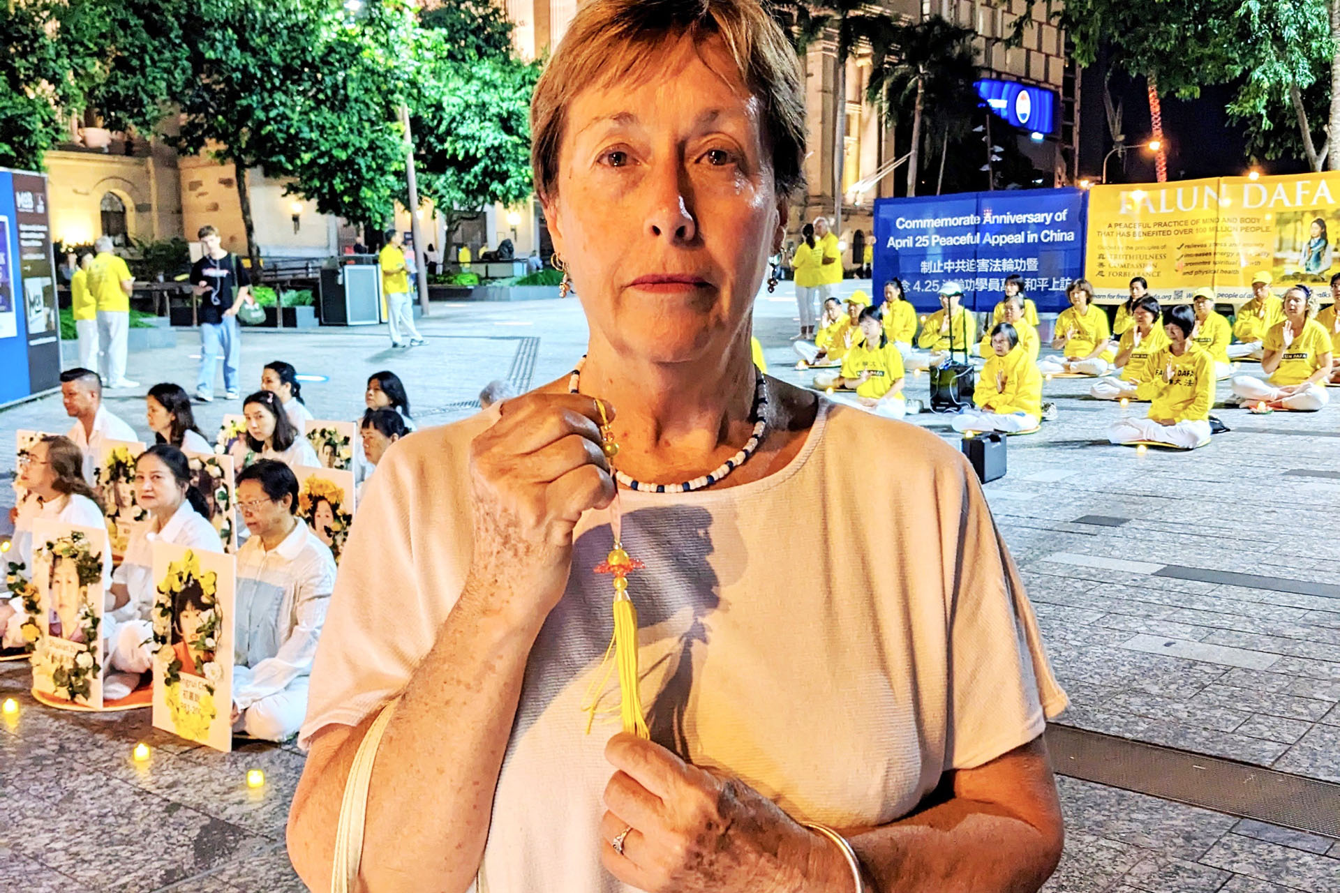 多萝茜·赖特(Dorothy Wright)经过活动现场时,当得知法轮功学员举办烛光悼念活动的原因后,毫不犹豫地签名支持法轮功学员反迫害。她说:“法轮功学员在自己的国家是遭受(中共)迫害的,无法举行集体炼功与烛光悼念活动。但是,澳洲很开放,可以允许集会,澳洲欢迎你们。”