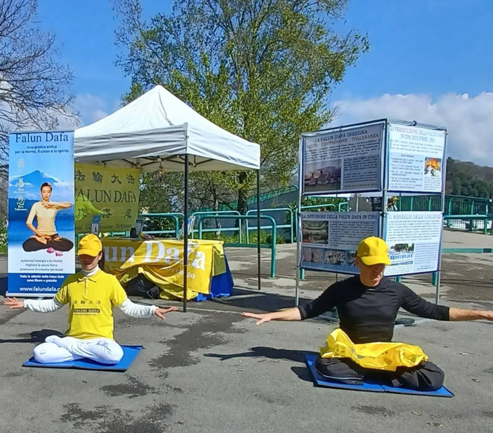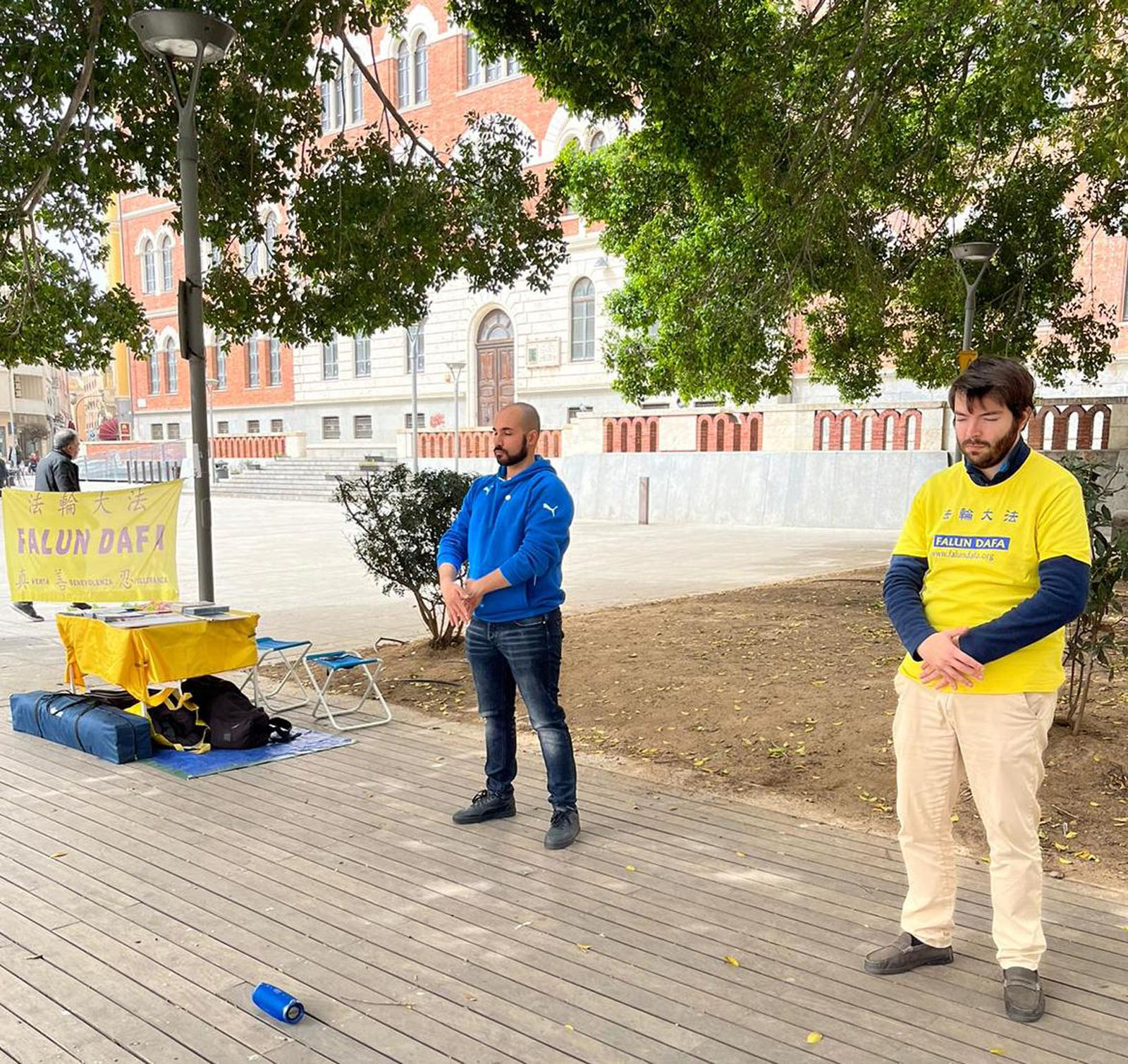 三月三十日星期六,意大利撒丁岛当地学员在首府卡亚利的加里波第广场(Piazza Garibaldi)布置了真相展板并炼功,向人们展示法轮大法功法及介绍法轮功修炼者在中国遭受迫害的信息。