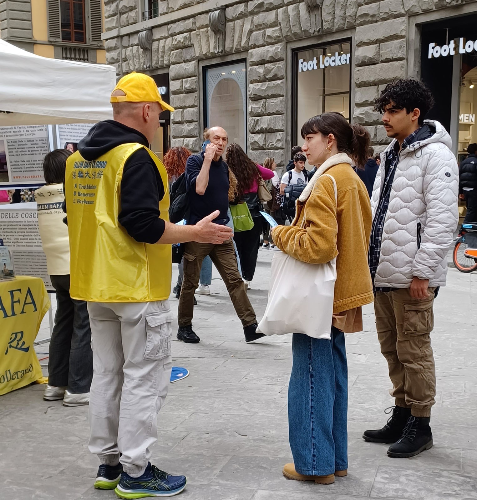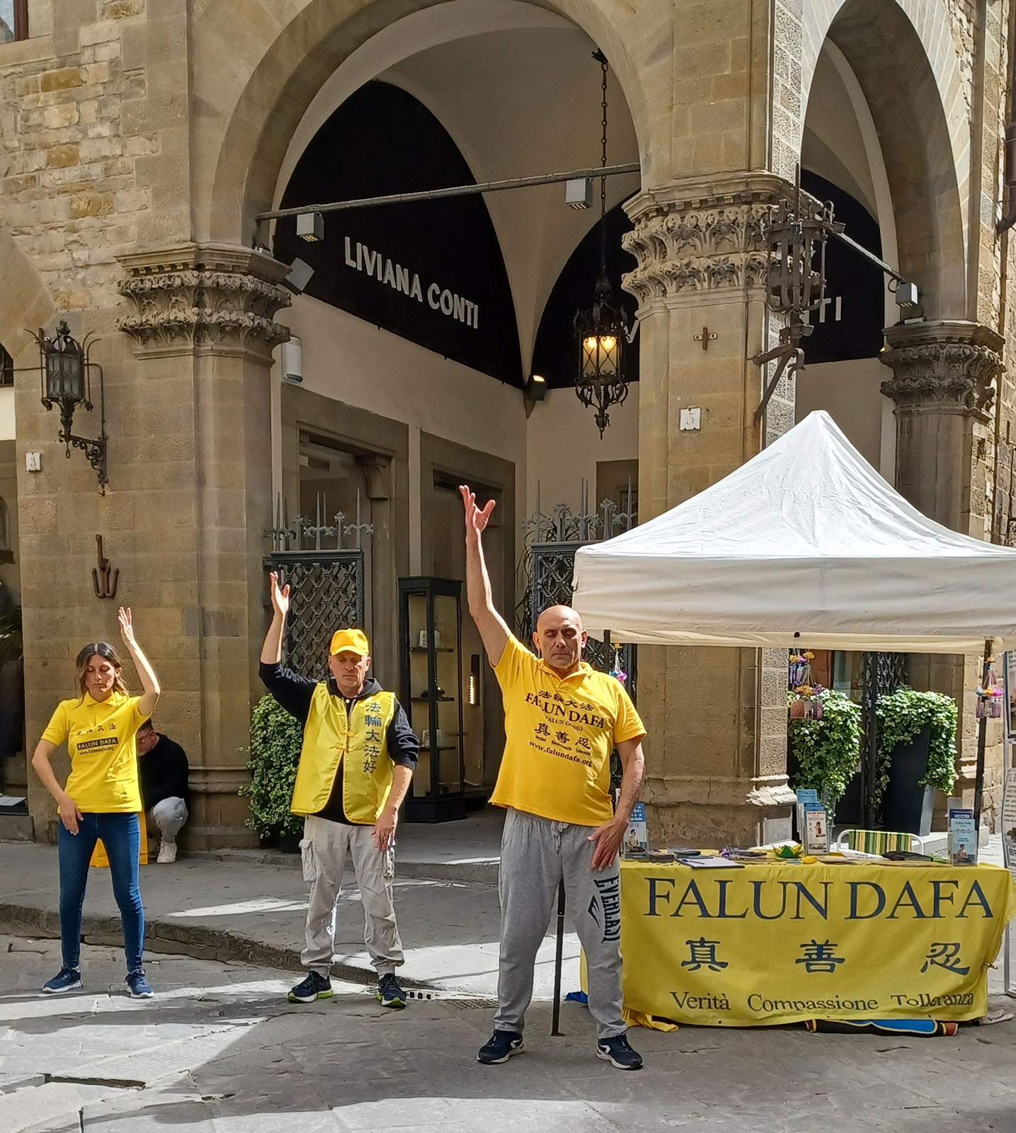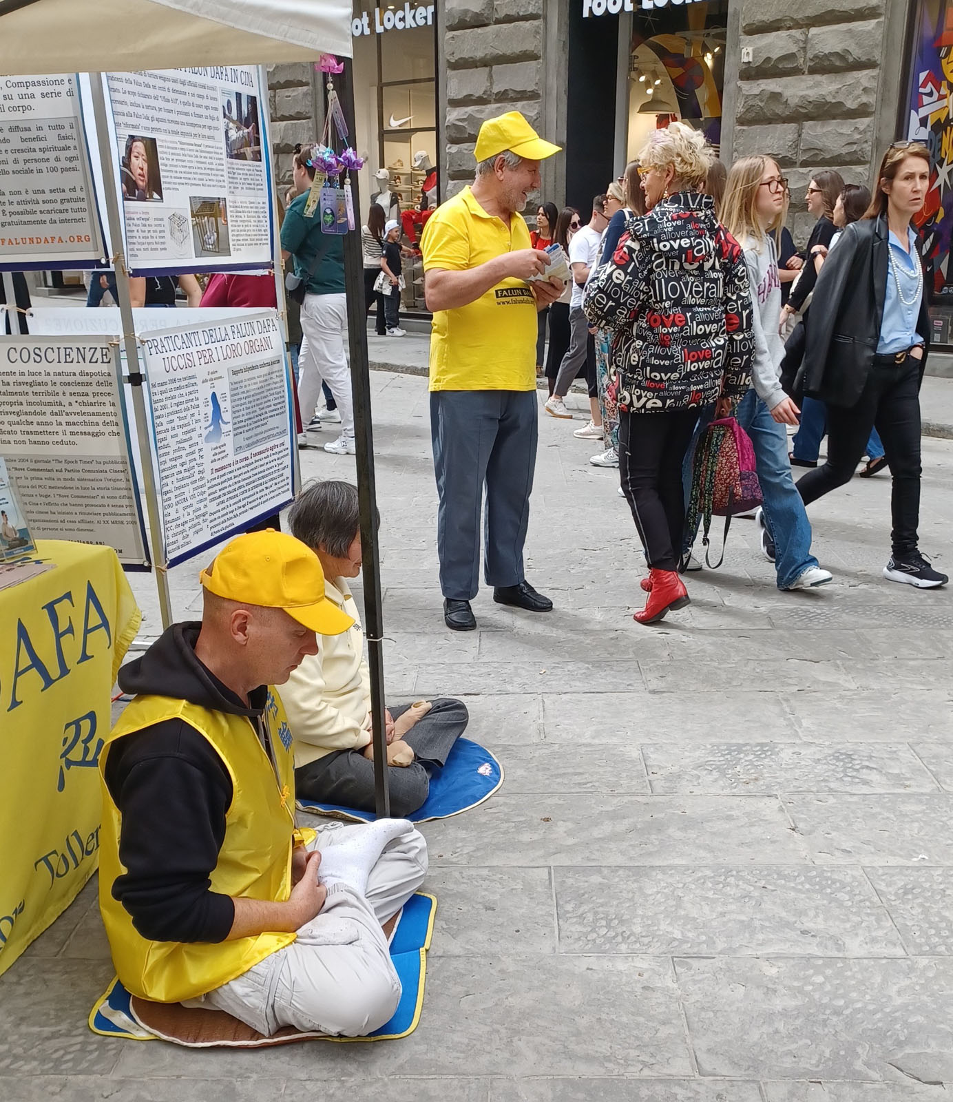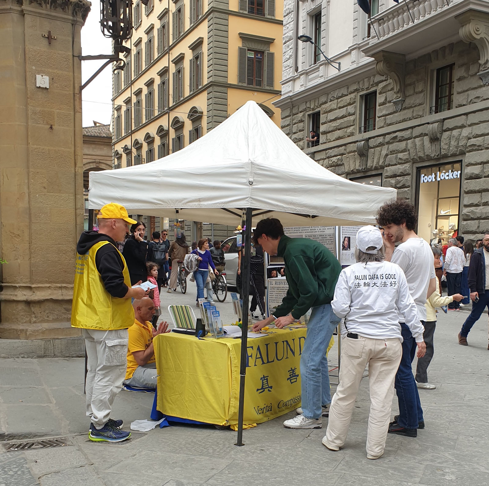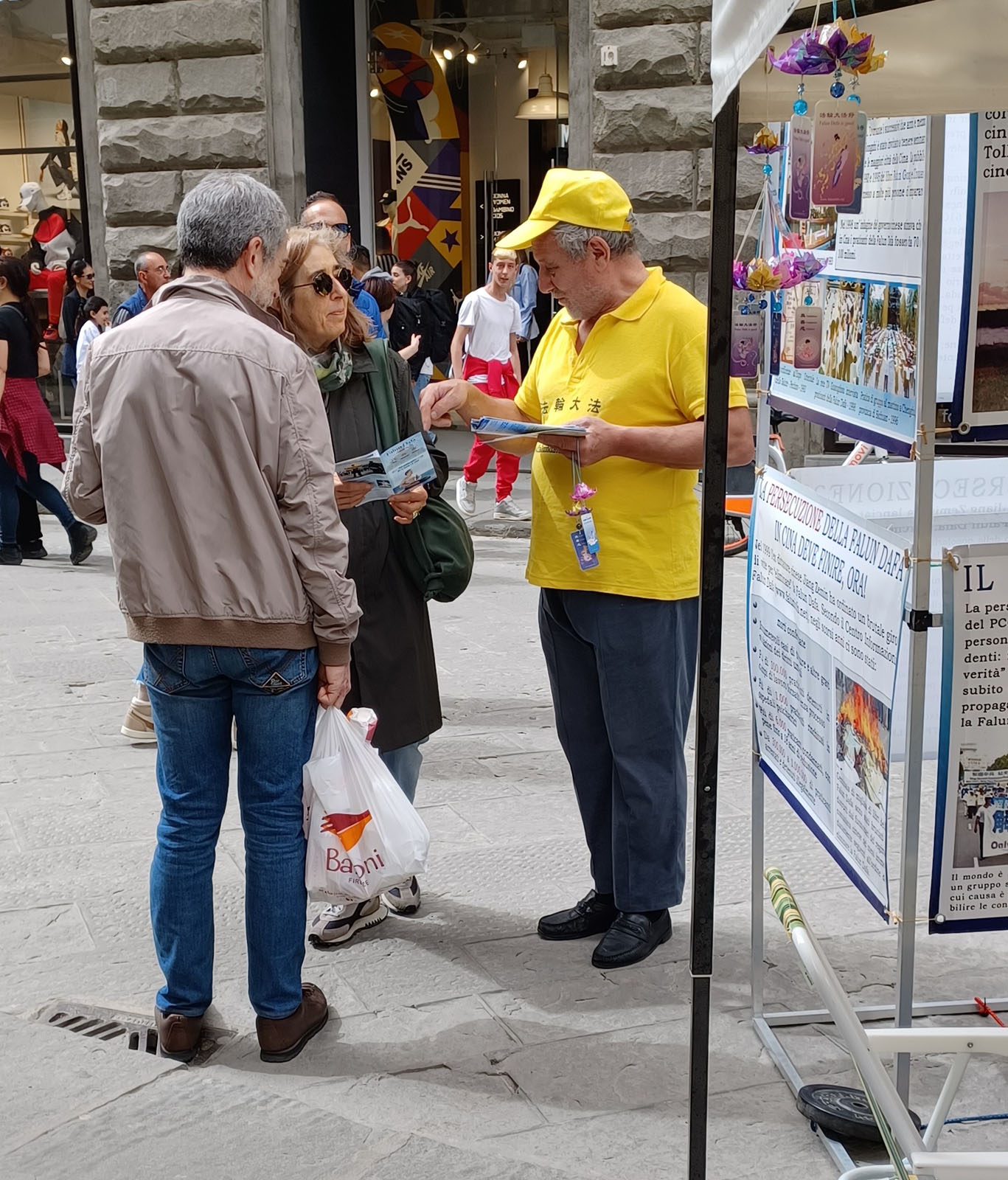 三月三十日星期六,当地法轮功学员在位于佛罗伦萨老城区的中心地段,奥桑米歇尔大道(Via Orsanmichele)再次举行了讲真相活动。