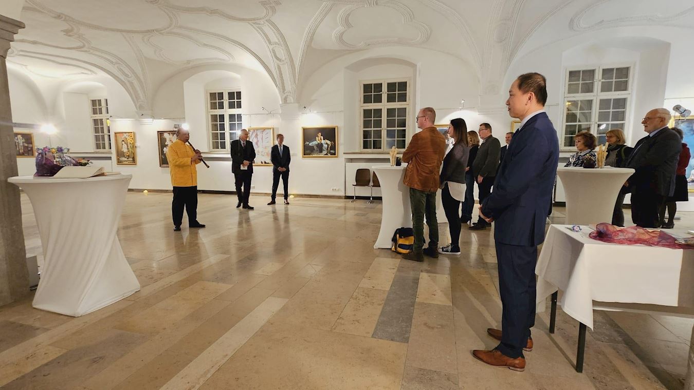 位于阿尔卑斯山北麓的坎普顿市是德国历史最悠久的城市之一,也是阿尔高地区(Allgäu)的政治、行政、商业中心。美展所在地是亲王府邸,它的历史可追溯到公元750年的一座修道院。欧式拱顶下,占地达四百五十平米的大厅更显宽广,洁白的墙面上罗列着美展画作,使整个大厅充满了静穆、庄严的气氛。
