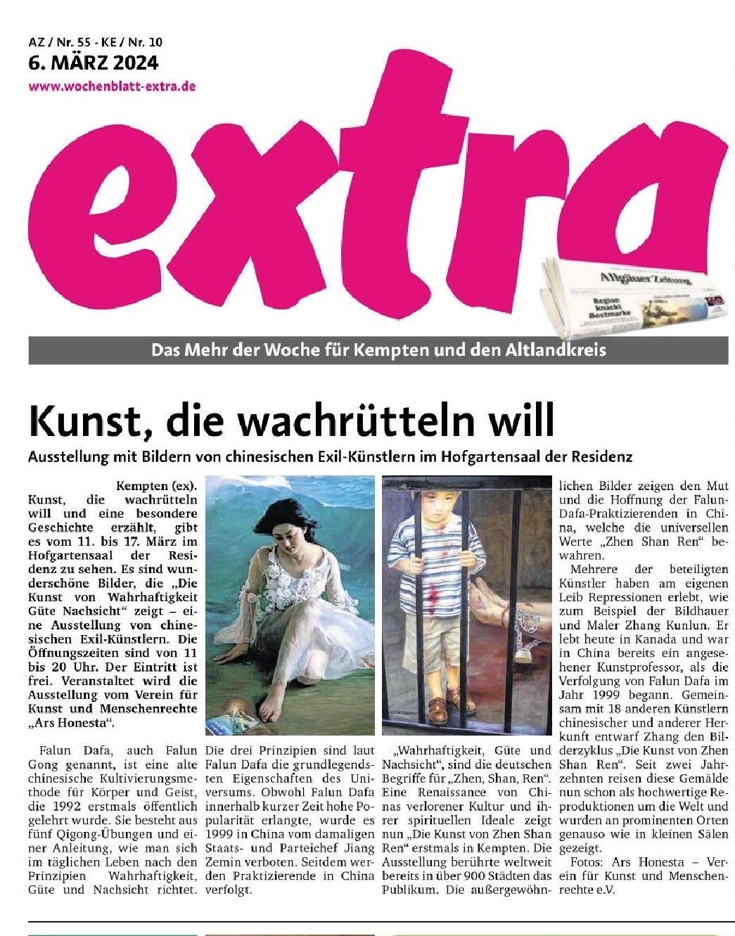 ![]() 图3:“阿尔高日报”(Die Allgäuer Zeitung)在三月六日的特刊中报道了当地即将举办真善忍国际美展的消息。 |