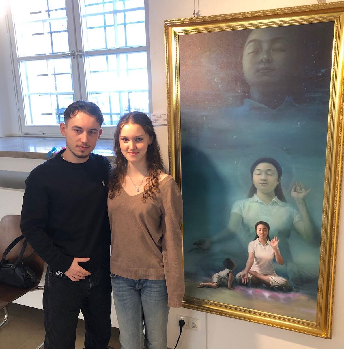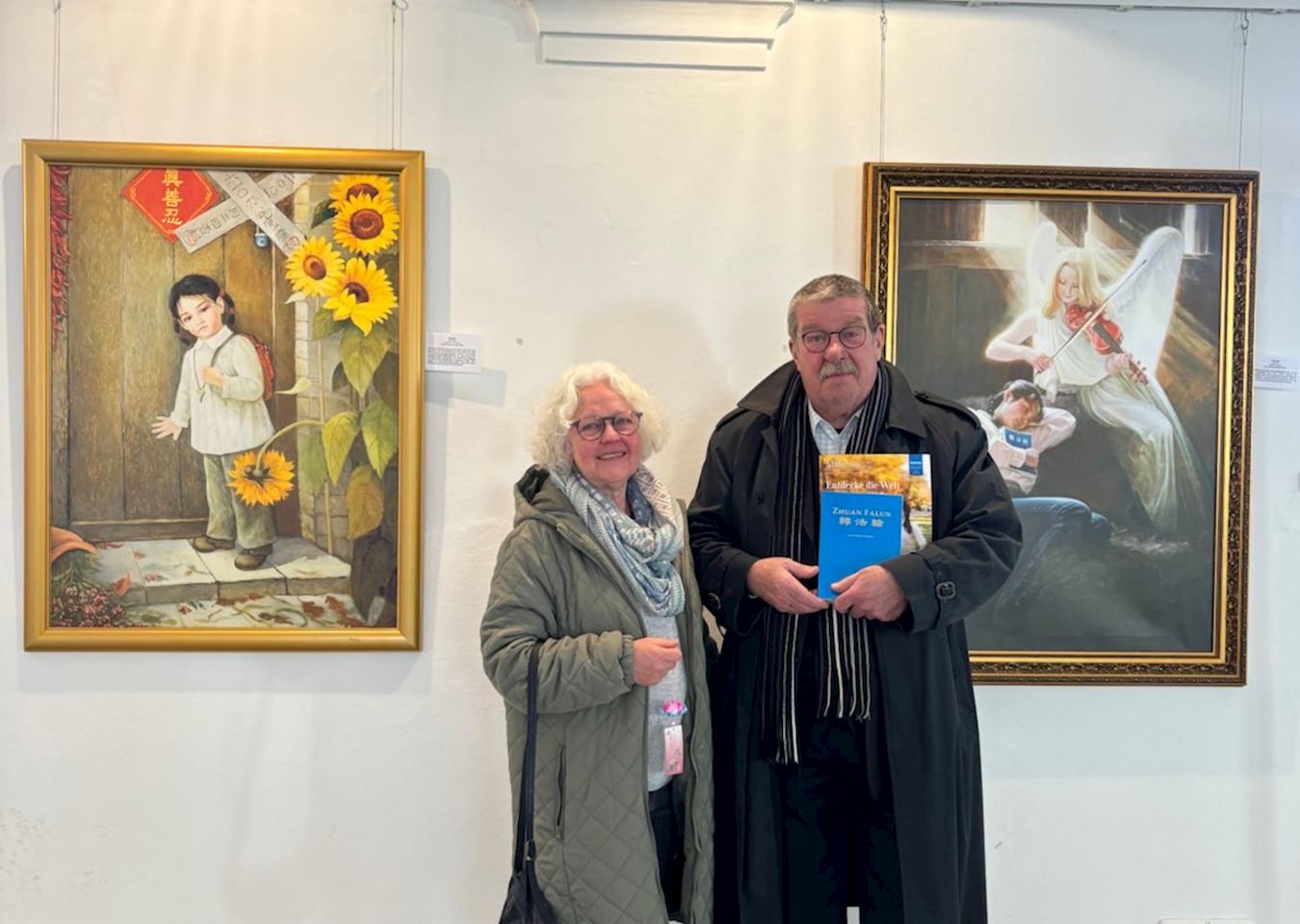 来自坎普顿的乌苏拉(Ursula)和安东(Anton)是一对夫妇。他们在聆听学员讲解的同时仔细欣赏了每一幅作品。从观赏第一幅画开始,安东就忍不住热泪盈眶。他表示《流离失所》这幅画最让他感动。画面描述了一位因迫害被迫远走他乡的年轻女孩,在途中疲惫的睡着了,怀中还紧紧抱着《转法轮》,于是,一位天使在她熟睡时来到她身边。