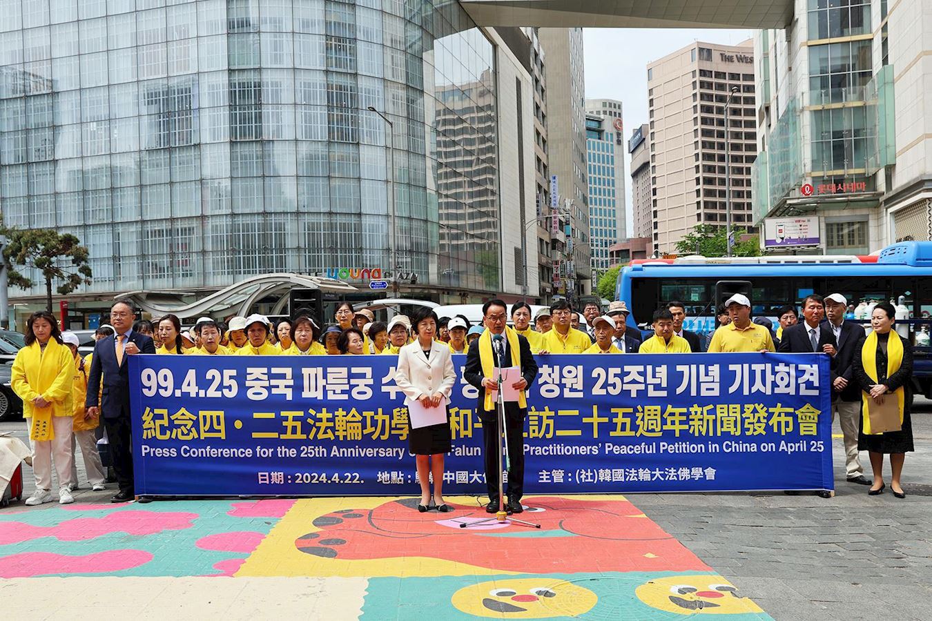 ![]() 图1:二零二四年四月二十二日上午,韩国部分法轮功学员聚集在首尔中区明洞中国大使馆前,举行了纪念“四·二五和平请愿”二十五周年新闻发布会。 |