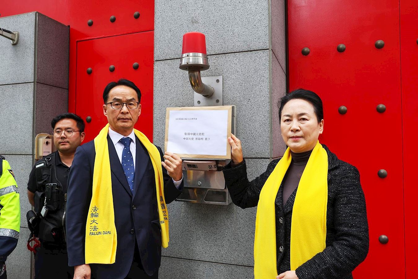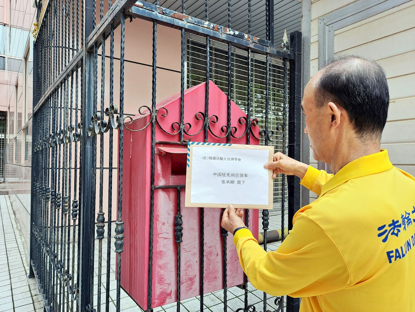 ![]() 图3:韩国法轮大法佛学会秘书长吴世烈将相关声明书投进中共大使馆信箱。 |