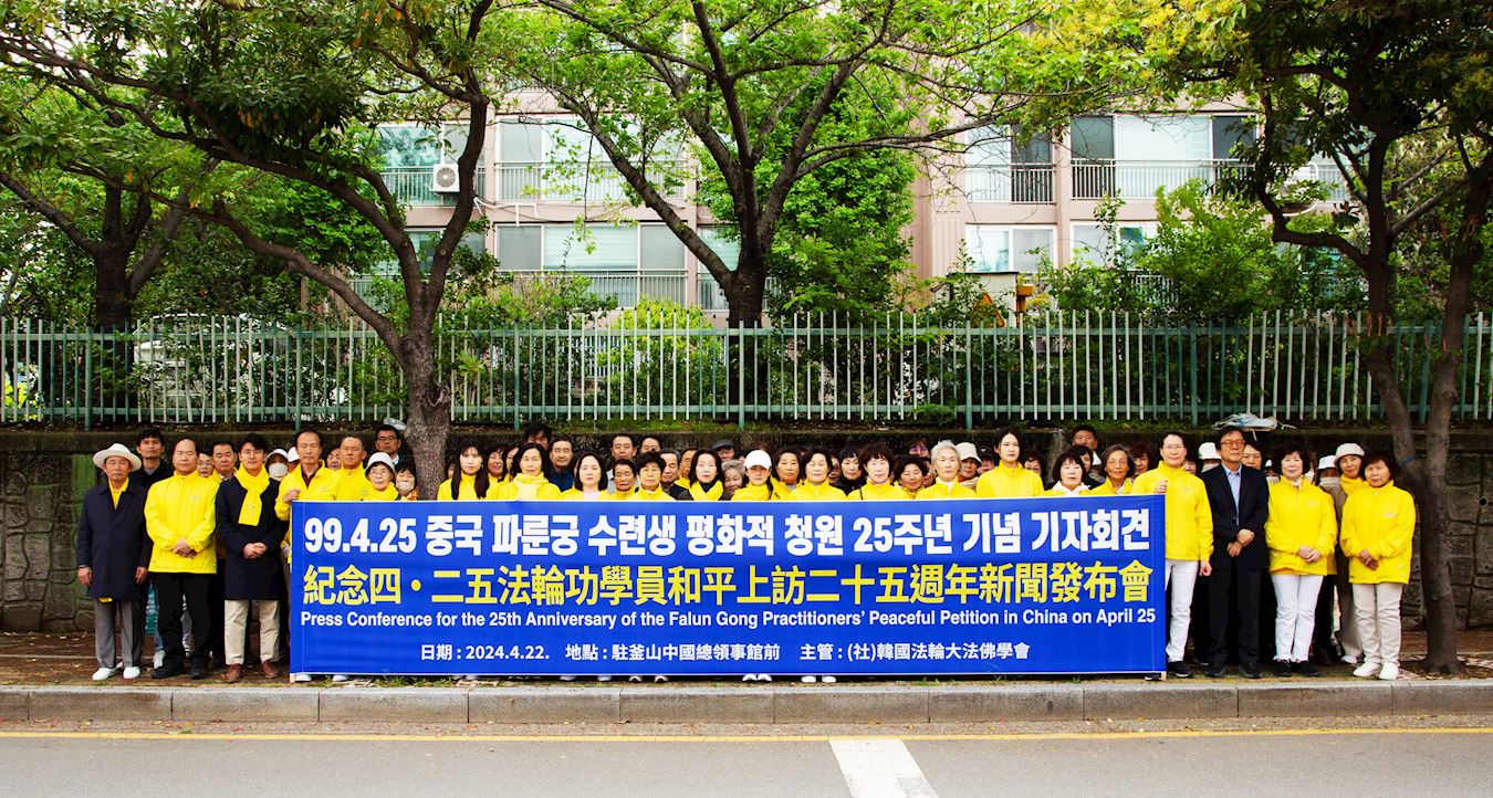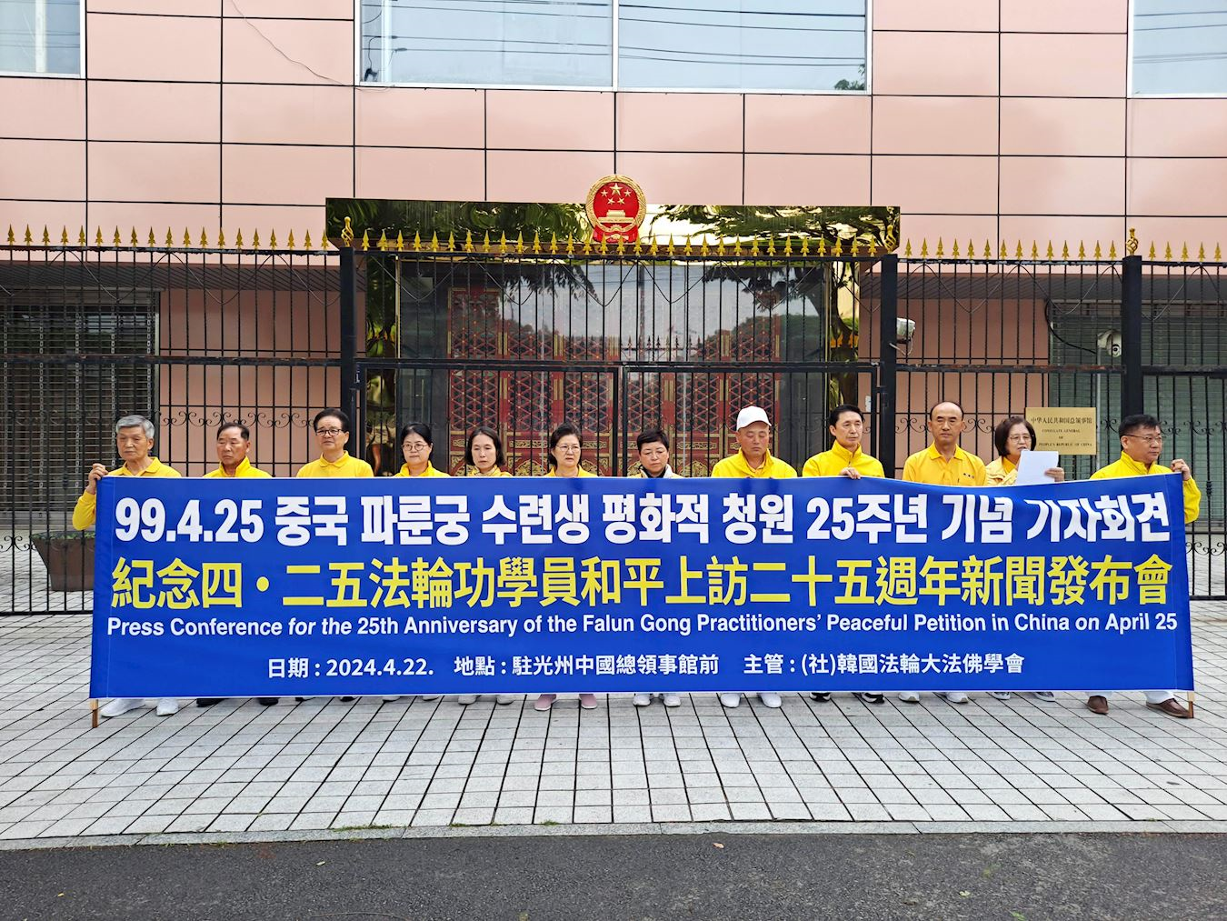 ![]() 图4:二零二四年四月二十二日上午,法轮功学员在韩国釜山的中国(共)领事馆前同步举行了新闻发布会。 |