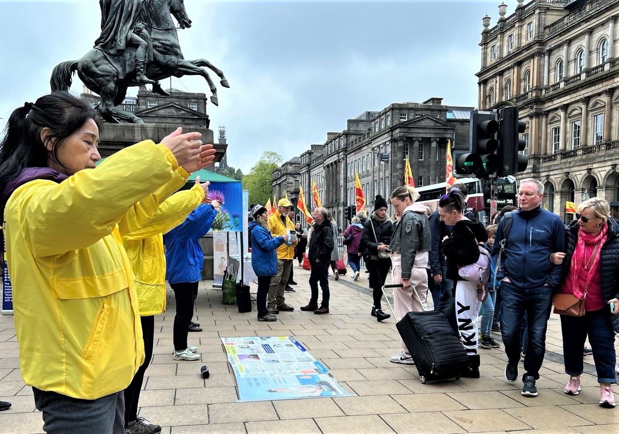 学员在最繁华的王子街威灵顿雕像旁搭起真相帐篷,英文横幅《法轮大法在苏格兰》悬挂在帐篷顶端,右侧立着法轮大法五套功法简介,左侧则是呼吁停止迫害法轮功的展板等信息。
