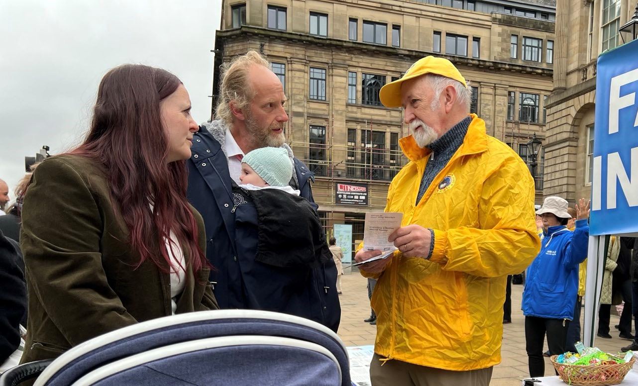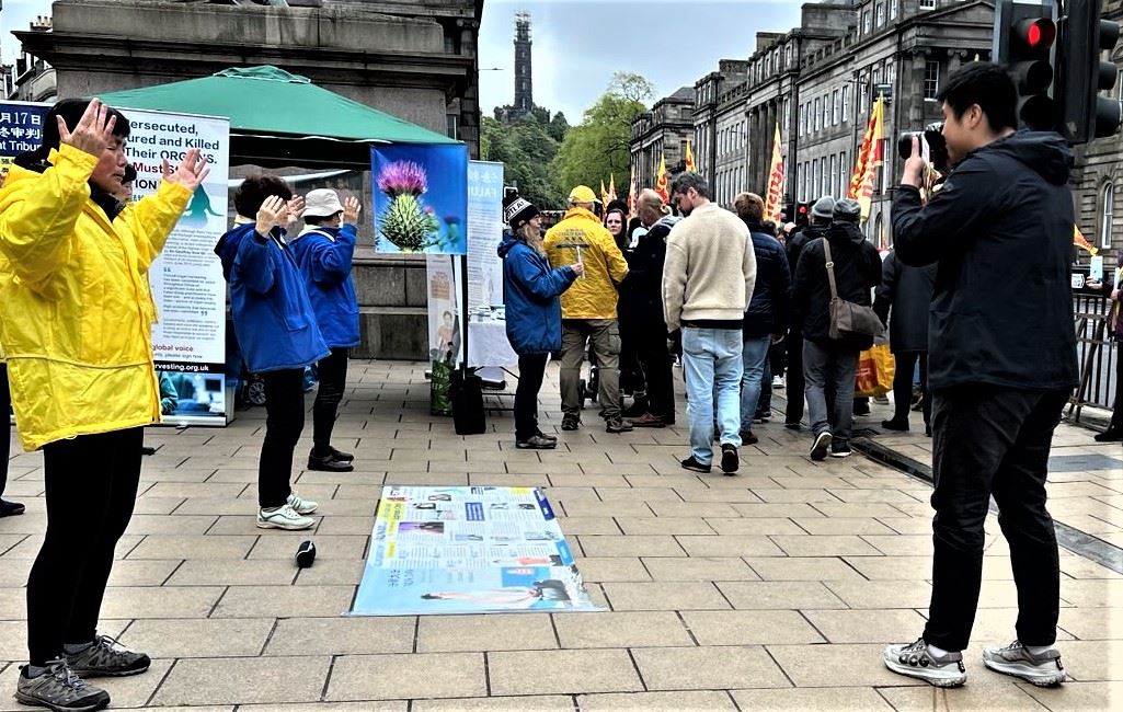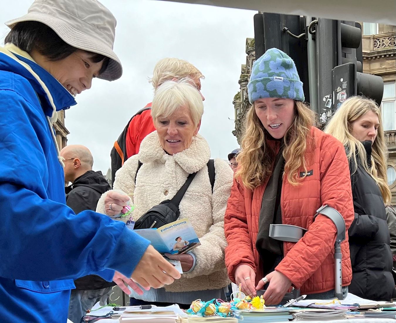 一个住在爱丁堡的男士径直走向学员,告诉学员他了解法轮功的真相,今天是来要学炼功法的。他说:“真、善、忍三个字,对一个生命来说太重要了。”得到当地免费教功班负责人的联系方式后,他开心地和学员留影。