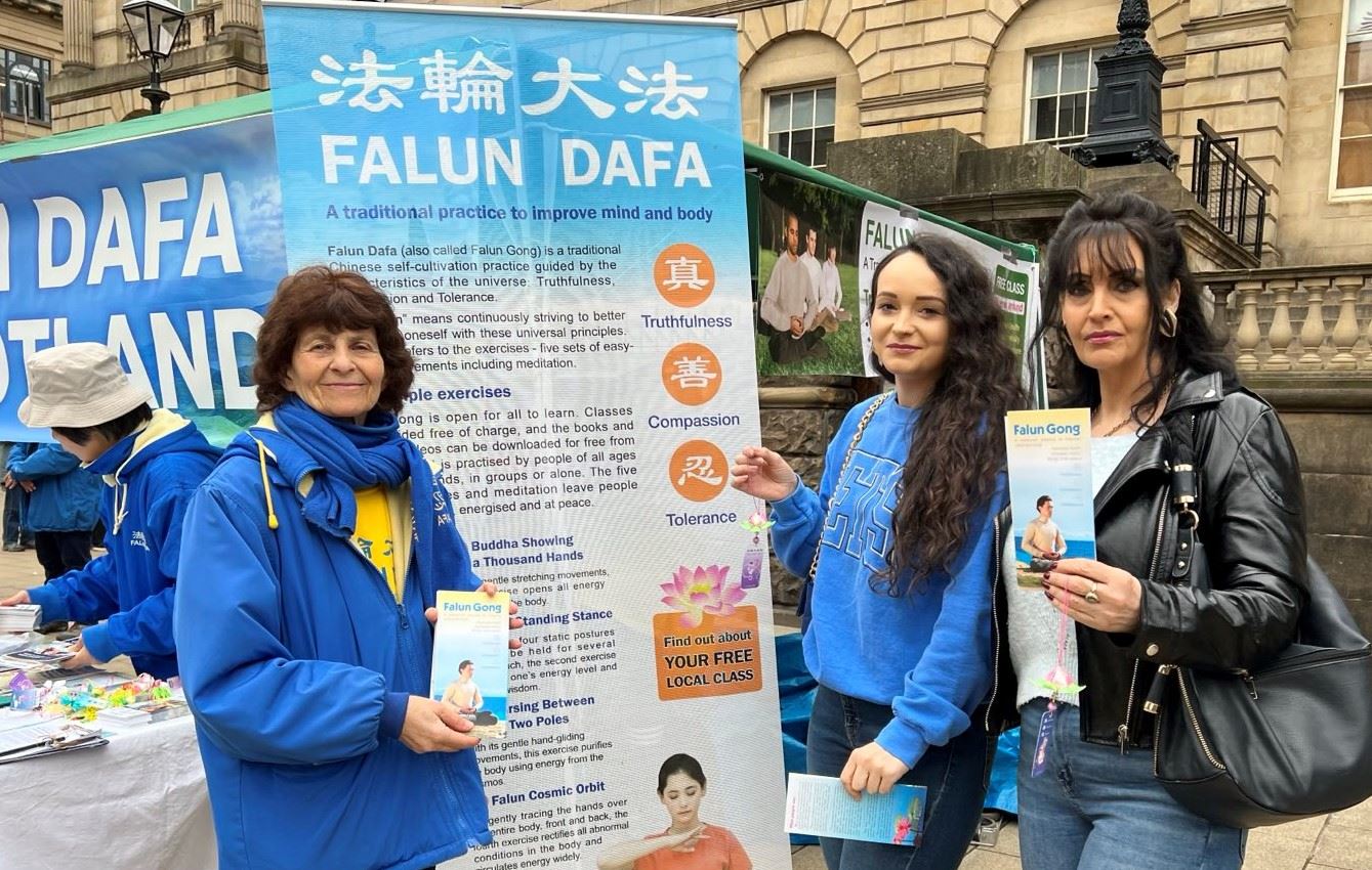 有三个女孩和一个男孩,来自英国的莫克姆(Morecambe),对学员展示的祥和的功法感到着迷,他们走过来问学员:“我们可以加入你们吗?”学员回答:“当然可以。”她们很开心地加入并和学员学炼功法。