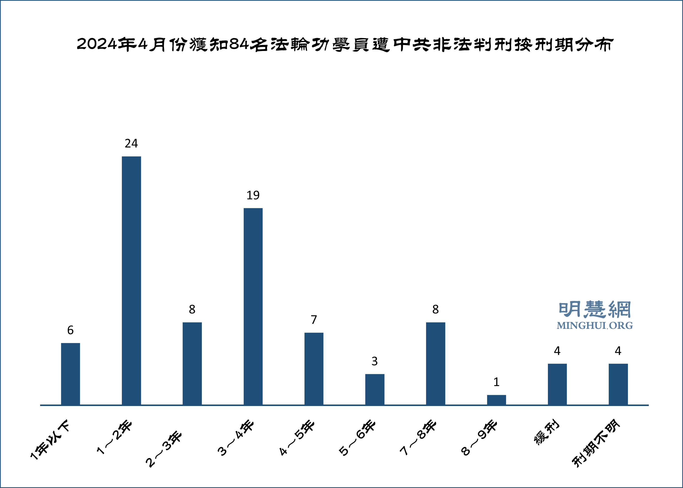 图1:2024年4月份获知84名法轮功学员遭中共非法判刑按刑期分布