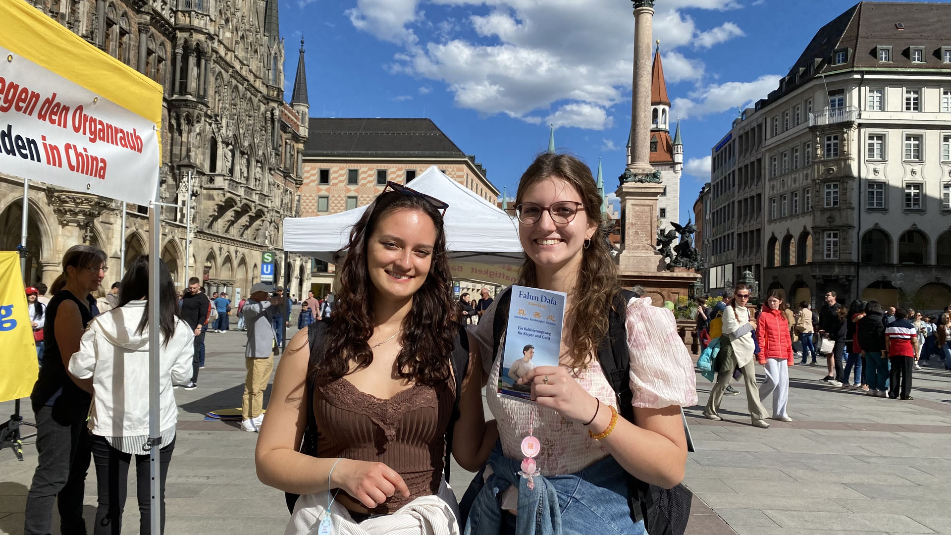 伊莎贝拉(Isabella,右)和姐姐都是德国人,在美国西雅图读大学,目前正回国探亲。路过玛利亚广场时,她们就主动到展位前,签名声援法轮功学员反迫害。