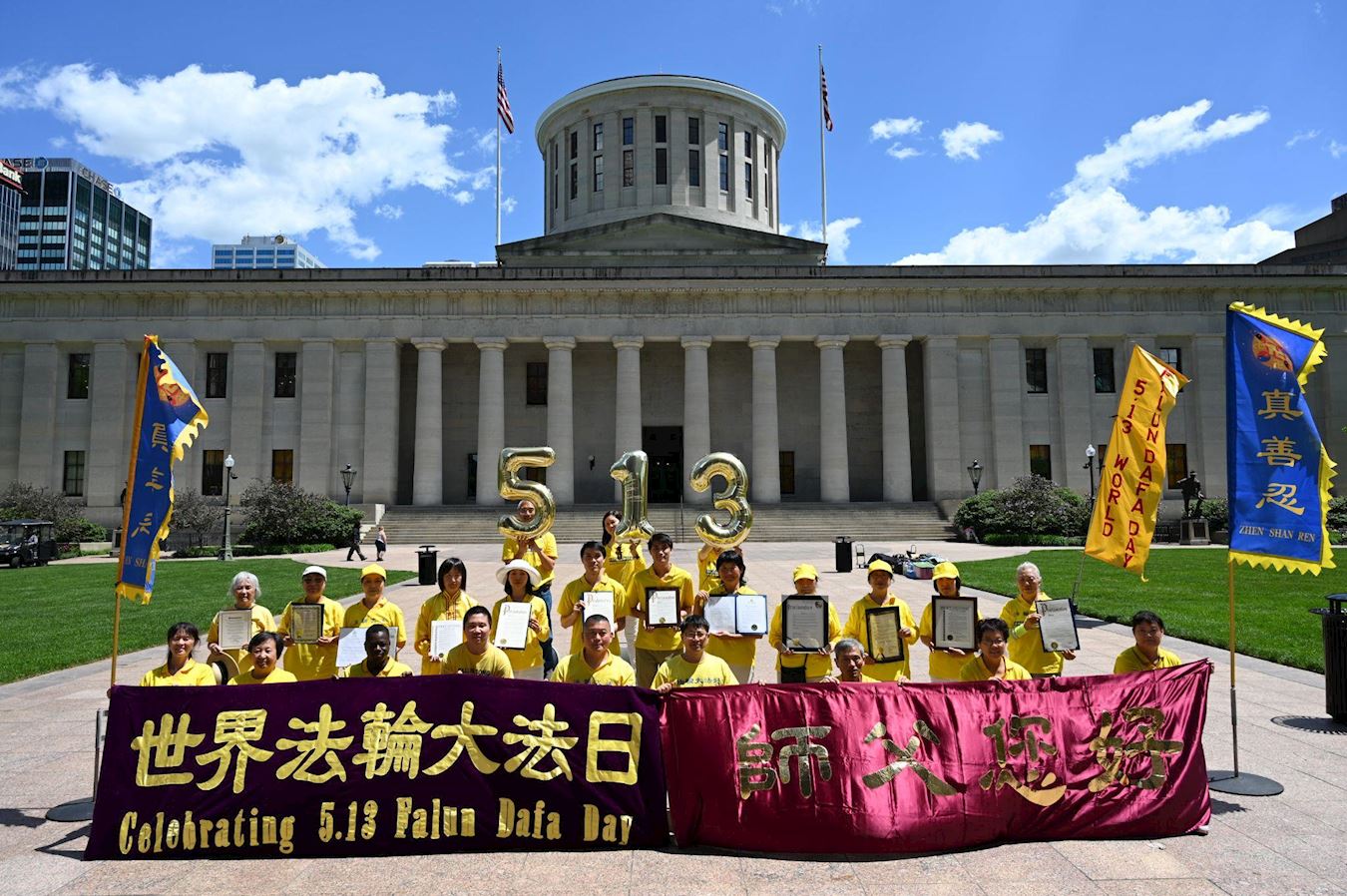 ![]() 图1:俄亥俄州部分法轮功学员在州议会大楼前合影留念,庆祝世界法轮大法日。 |