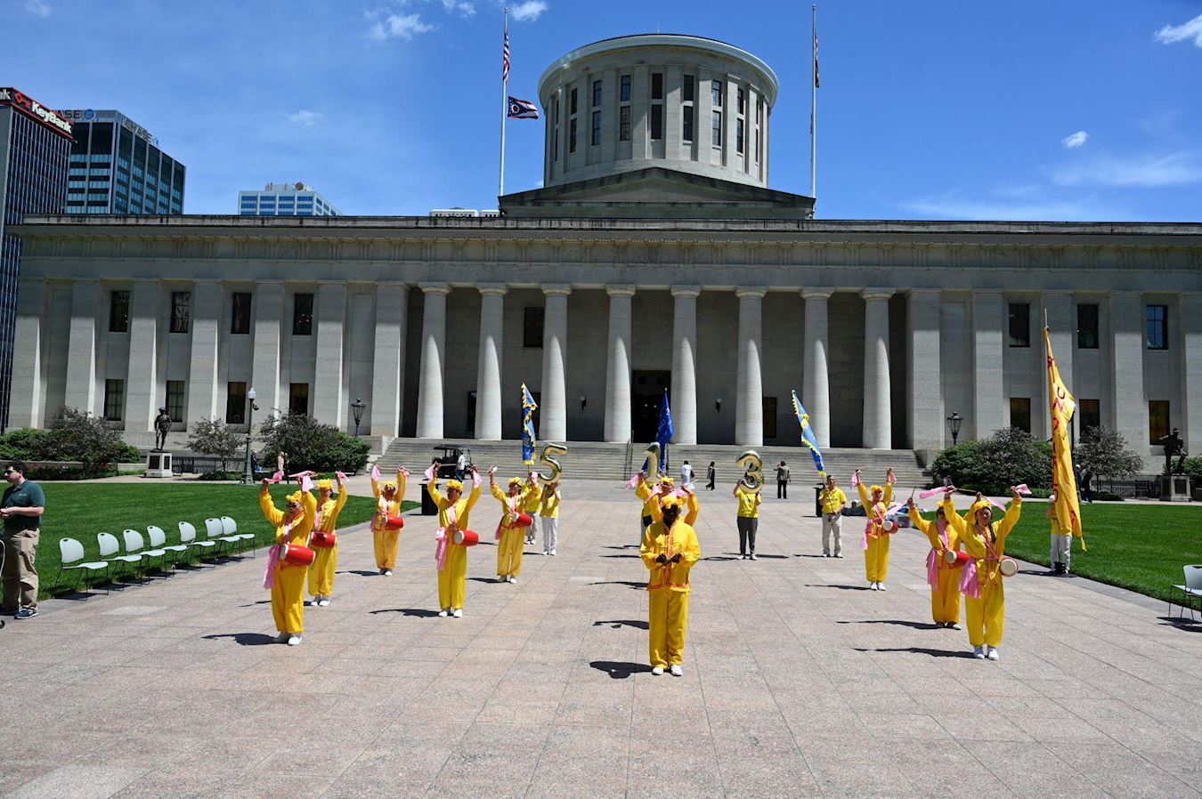 上午十一点半左右,法轮功学员在州议会大厦的广场前举行集体炼功,展现法轮大法的美好,随后学员们展示俄亥俄州议员和市府颁发的十四项褒奖并合影留念。活动在阵阵腰鼓声中圆满结束。