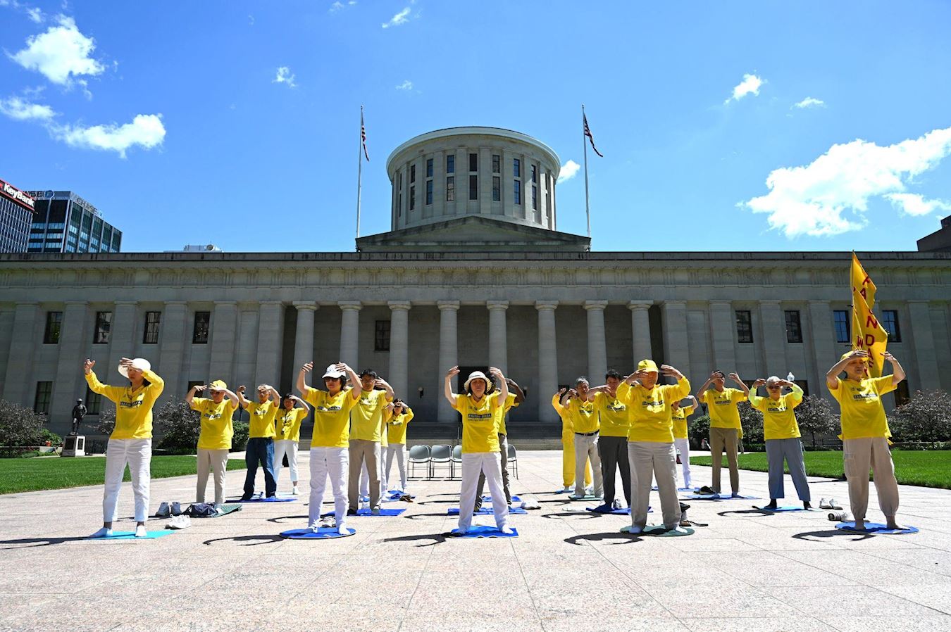 ![]() 图3:法轮功学员在州议会前集体炼功,展示法轮功功法的美好。 |
