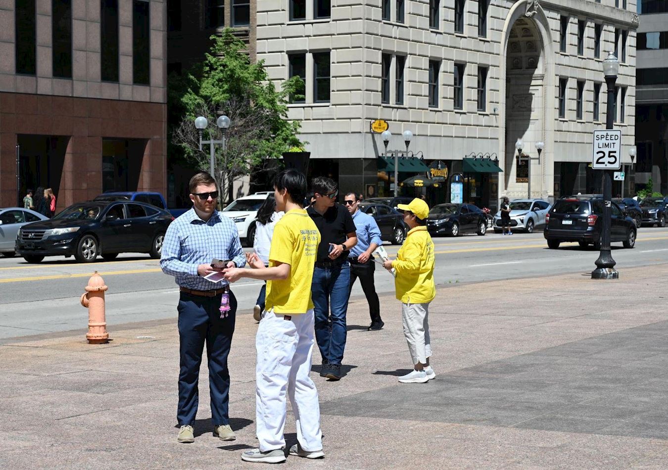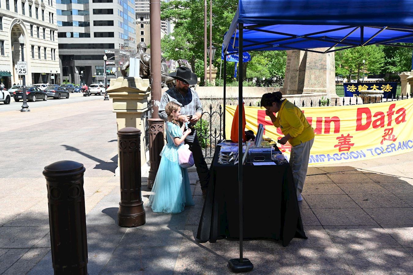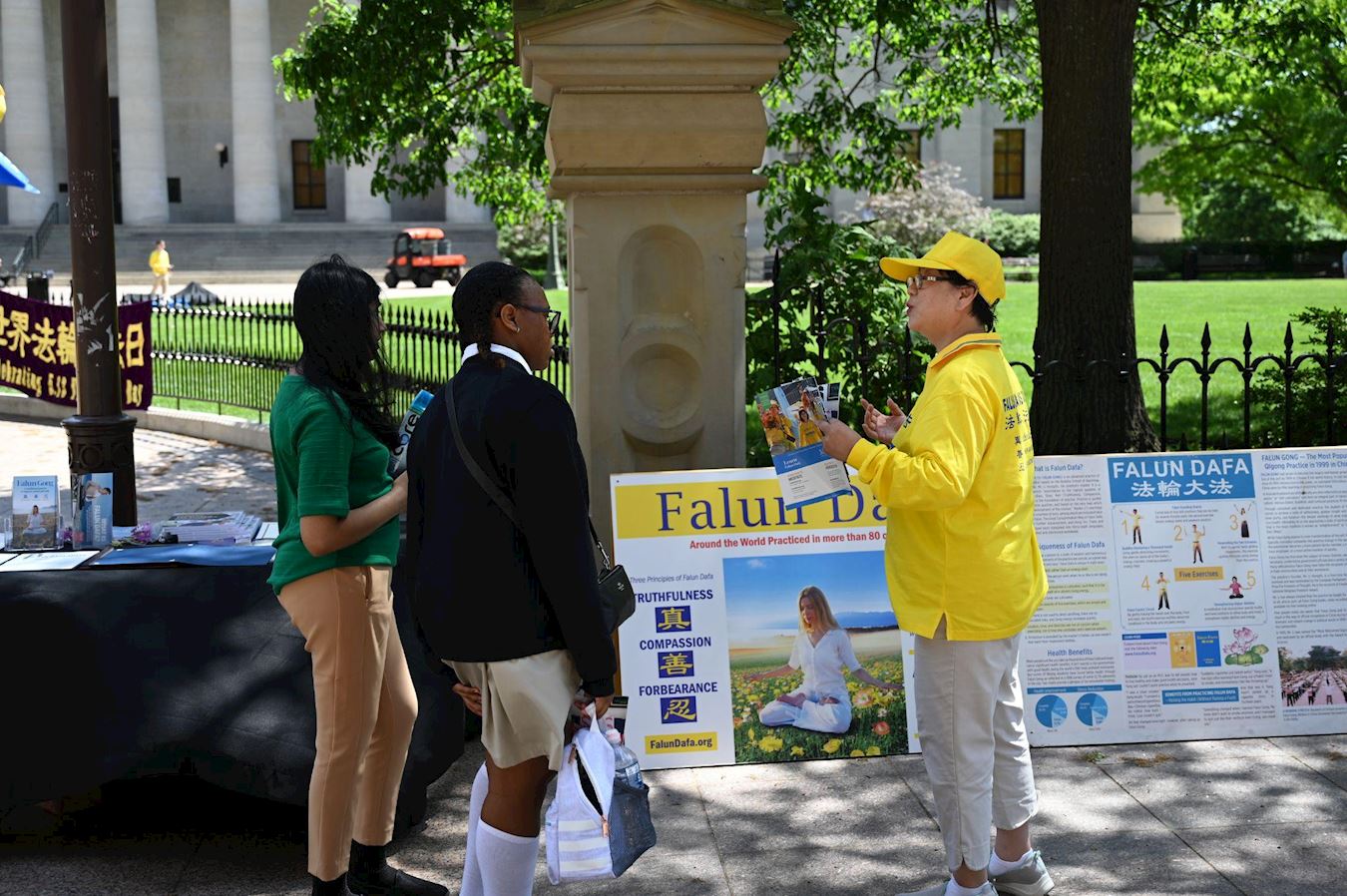 在靠近人行道的一侧,法轮功学员也布置了大法经书和印有“真善忍”和“法轮大法好”T恤衫的展位。多位民众来到展位前想要了解更多有关法轮功的讯息,并带回了法轮功真相传单,有四位有缘人最终购买了大法书籍。