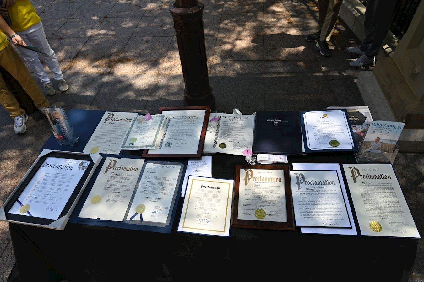 当日天气晴朗,阳光和煦,惠风和畅。学员们在州议会广场布置了多个横幅,印有“世界法轮大法日”和“师父您好”等,两侧还有数面大旗,印有法轮图形和“真善忍”字样,迎风飞扬,十分壮观。