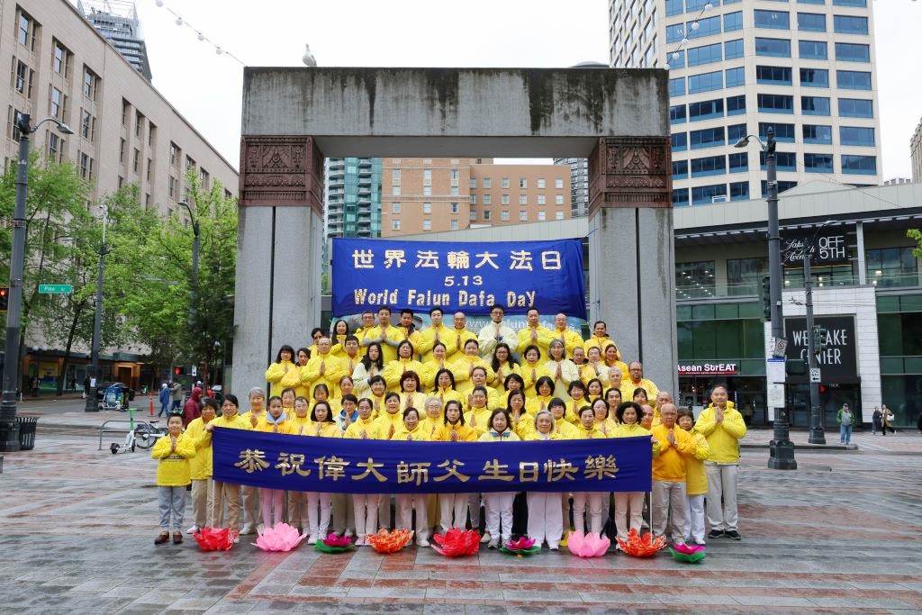 在活动当日,西雅图法轮功学员们首先在西湖公园合影,他们双手合十献上对李洪志师父的祝福:“西雅图大法弟子恭祝师尊生日快乐!法轮大法好、真善忍好!”
