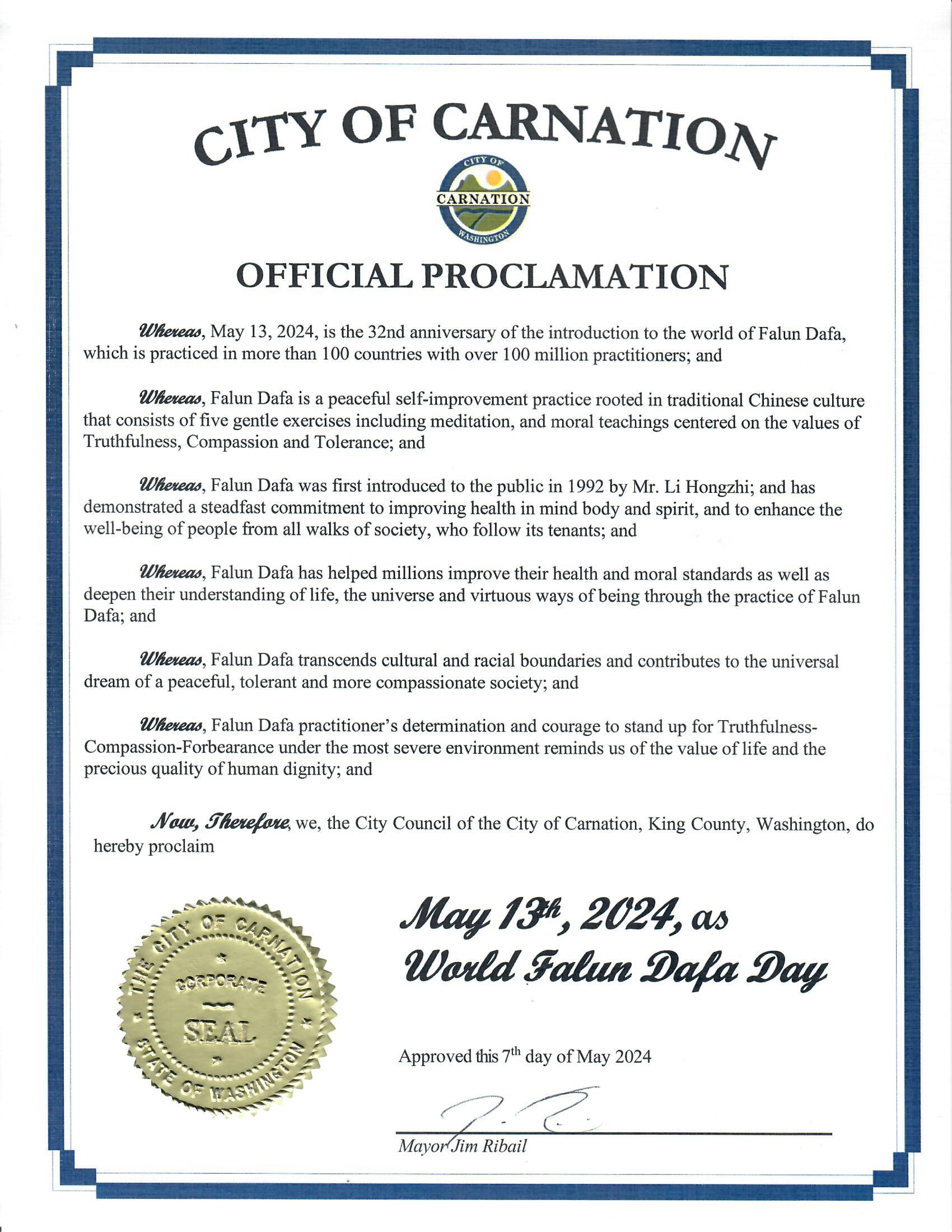 华盛顿州康内申市(Carnation)继去年后,今次是第二次为世界法轮大法日颁发褒奖。康内申市颁发的“世界法轮大法日”褒奖。