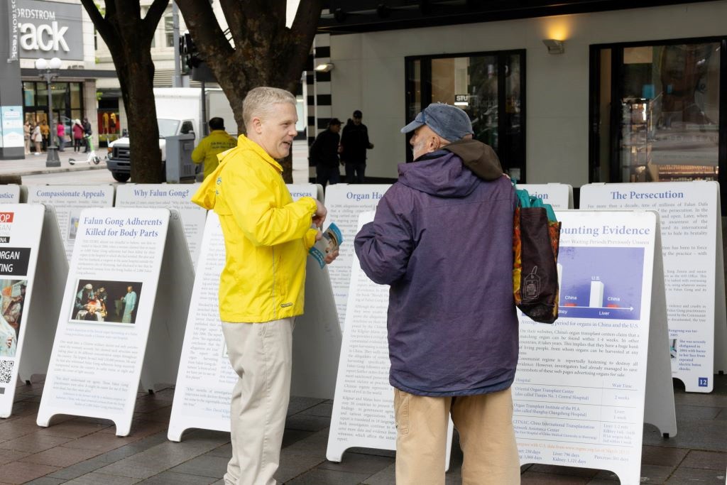 来美国探亲的苏格兰游客表示,他之前耳闻中共的暴行,但还不太了解法轮功。他仔细的询问学员,想了解中共迫害法轮功的原因,学员与他详谈许久。听了真相之后,这位游客对法轮功学员表示非常同情。