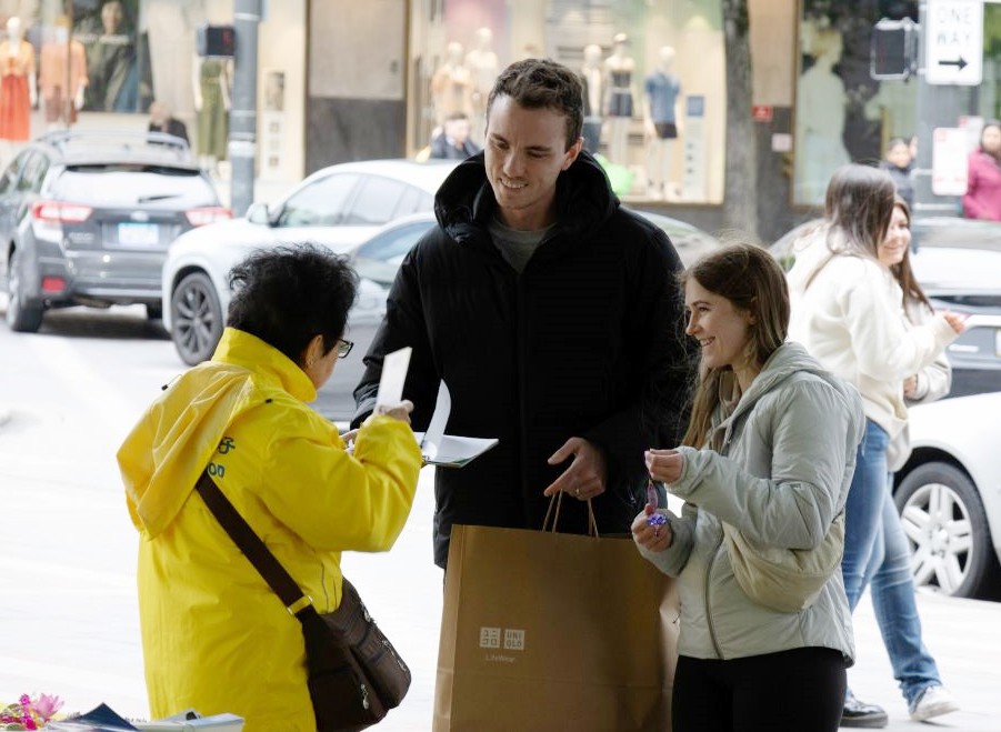 一位在美国出生长大,他的母亲是中国人,经过活动现场时,因之前受到中共造谣的影响,他询问学员,关于中共宣传法轮功学员“自杀”。学员以亲身经历,向他解释了法轮功珍视生命、不杀生以及中共在迫害中的污蔑手段。这位行人离去时,并表示自己不会再相信中共的虚假宣传。