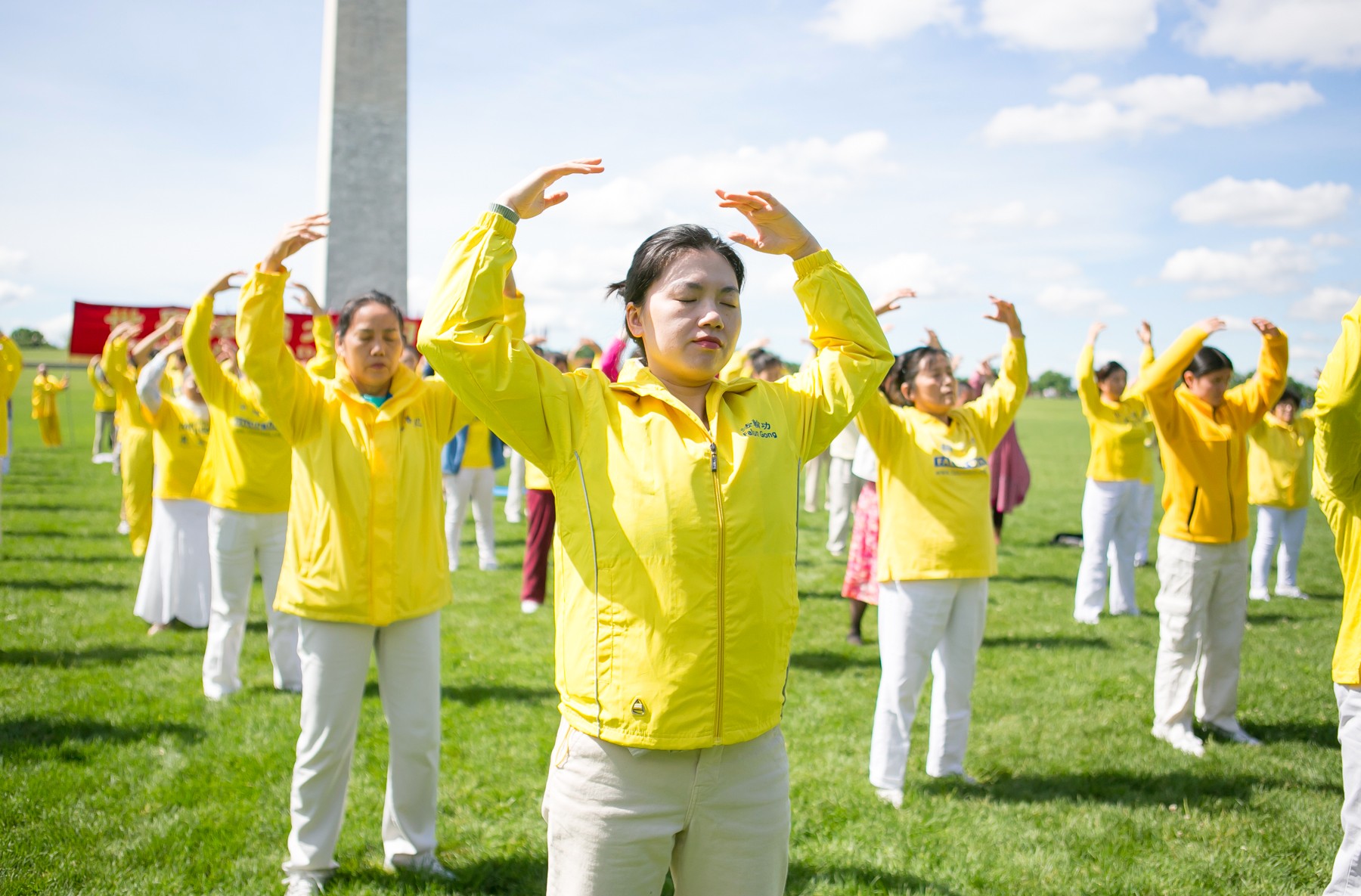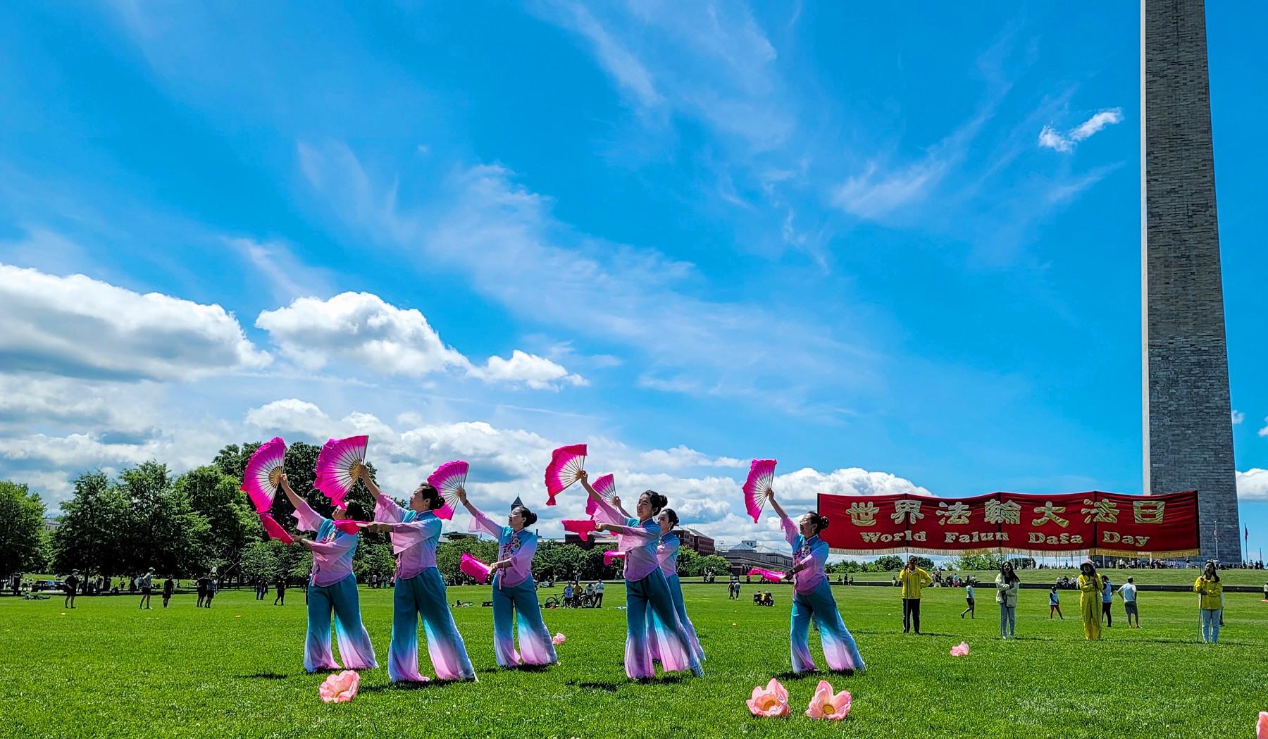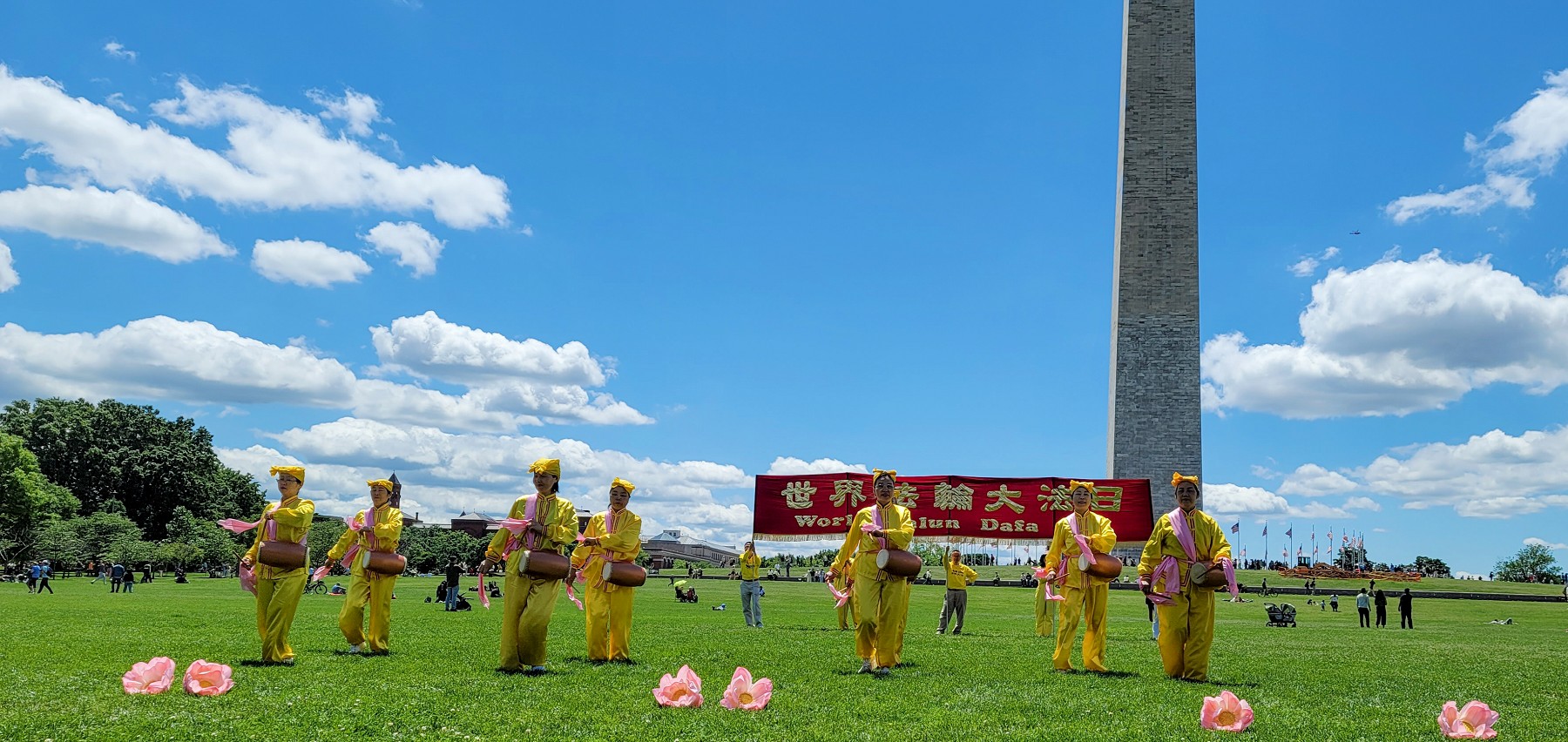 星期六上午,大华府地区不同族裔的法轮功学员在华盛顿纪念碑附近的国家广场大草坪上集体炼功,随后以舞龙、腰鼓、舞蹈等表演庆祝“世界法轮大法日”。