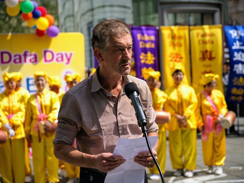 欧洲法轮功之友主席约翰·迪(John Dee)在发言中说:“法轮大法对数以百万计的人产生了深远的影响,改变了他们的命运。教导人们对他人怀有同情心,鼓励人们先反省自身缺点,而不是怨恨他人,并始终努力寻找真相。我们希望这些积极因素最终能成为人类历史的转折点。我们要感谢李洪志大师,并祝愿他生日快乐!“