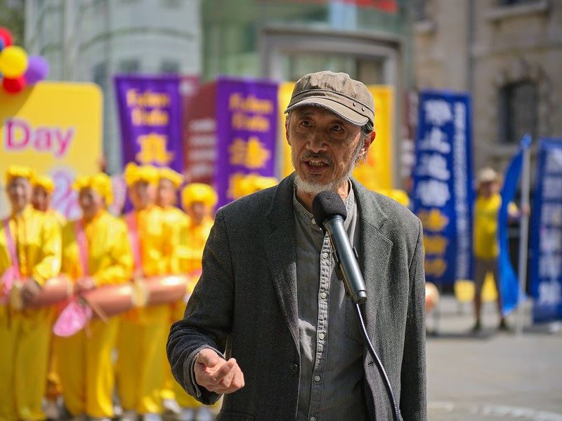 旅英著名作家马建在集会中发言,他向李洪志先生表示感谢,并说:“中共不会给我们带来美好、带来和平。真善忍是一种正确的理念,而这个理念必须传播。”