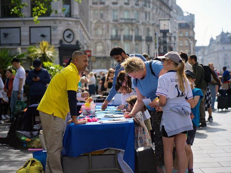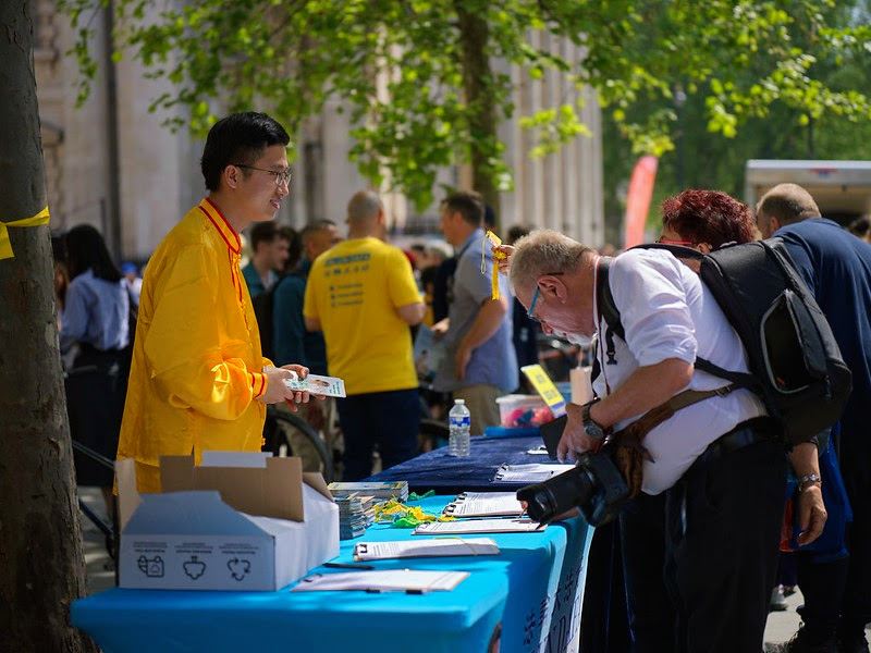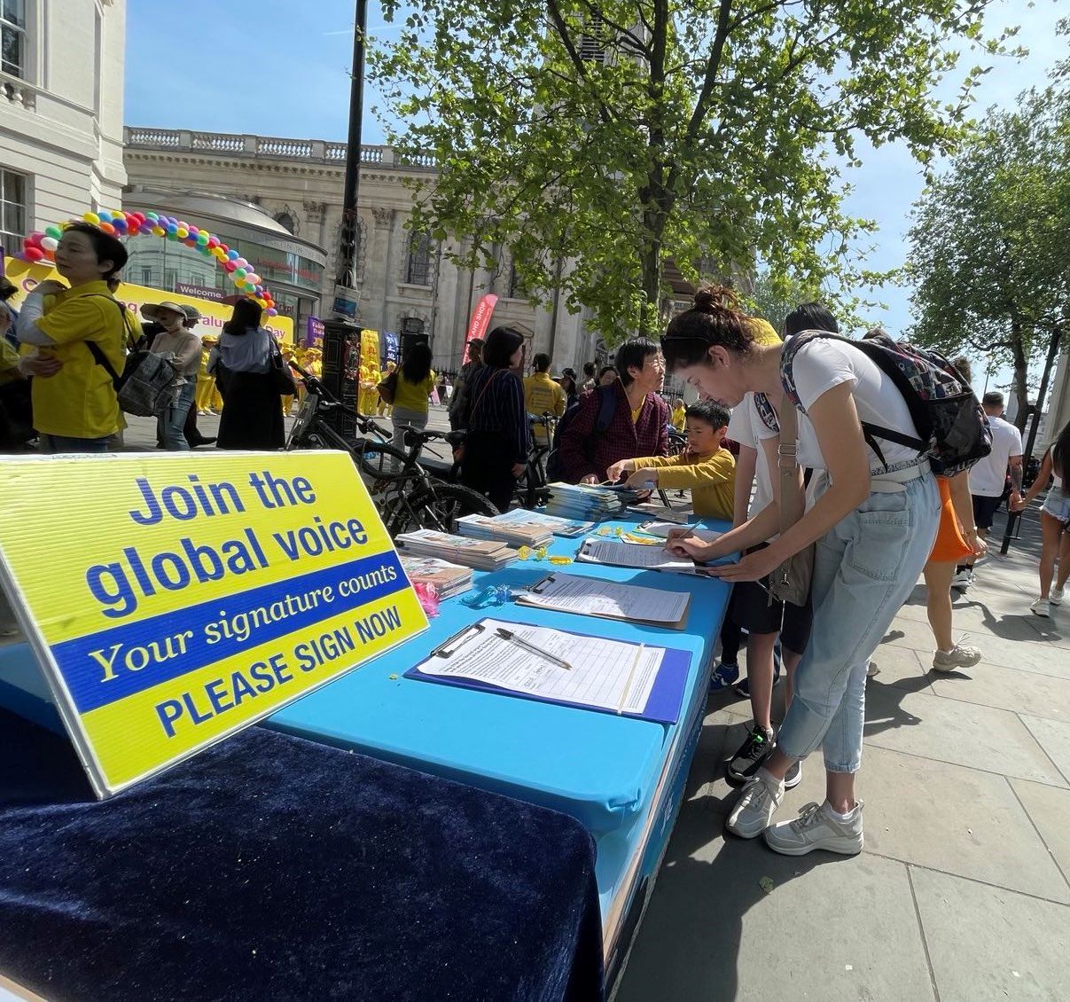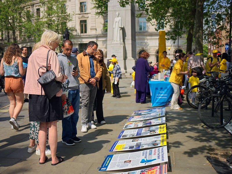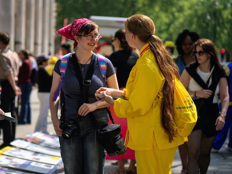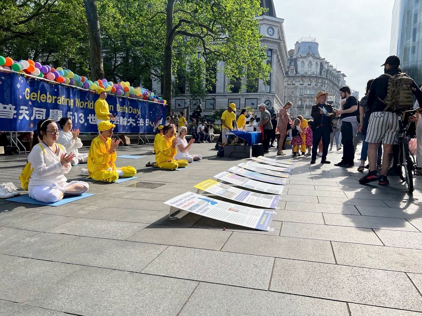 壮观的游行队伍吸引了众多路人纷纷拍照、录像。最后在圣马丁广场,法轮功学员举行新闻发布会。并在圣马丁广场、莱斯特广场和唐人街展开一天的弘法活动。