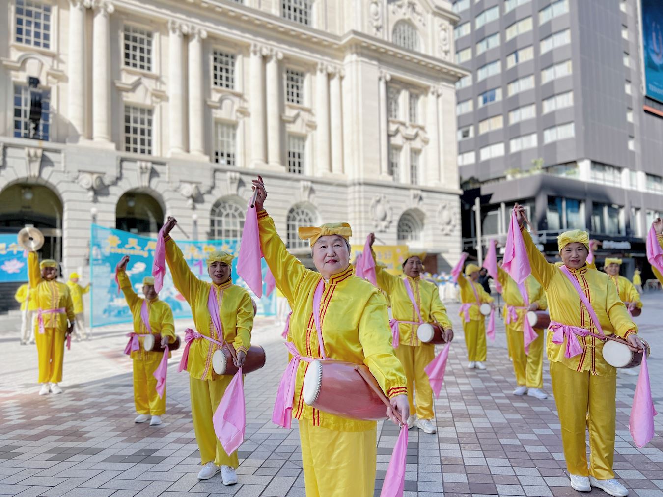 庆祝活动上,由学员组成的天国乐团、腰鼓队的表演,以及舞蹈表演受到了民众的欢迎。不少人拿到法轮大法的介绍资料,立即就在一旁的展位上学炼法轮功功法。