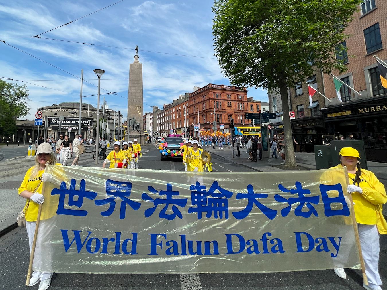 '图1~3:二零二四年五月十一日,爱尔兰法轮功学员在首府都柏林举行游行。欢庆世界法轮大法日。'