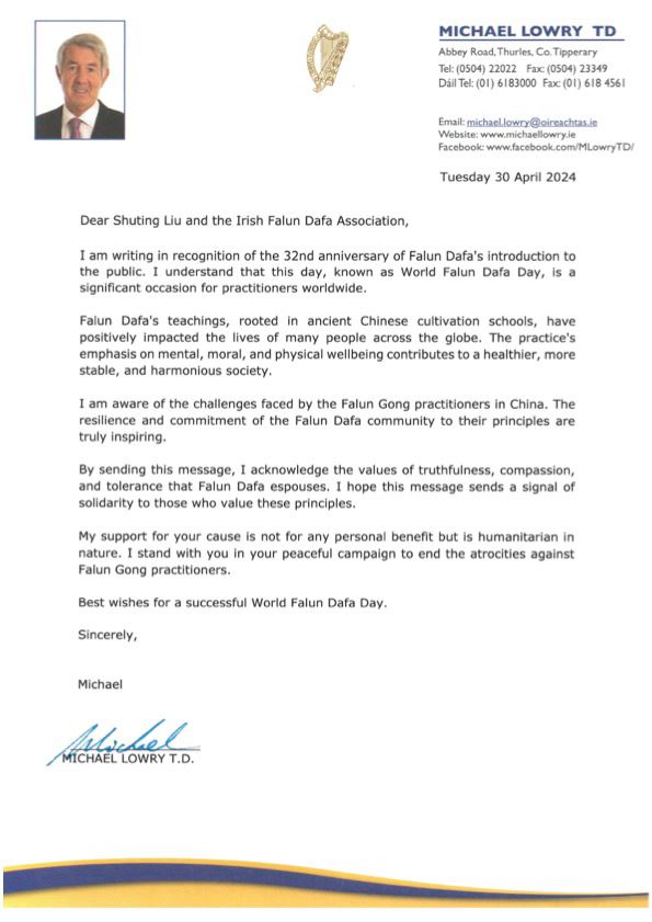 独立议员麦克尔・路瑞(Michael Lowry)在法轮大法弘传三十二周年之际,致函支持。他在信中说,“法轮大法日这一天,对全世界的修炼人而言有着特殊的意义。”