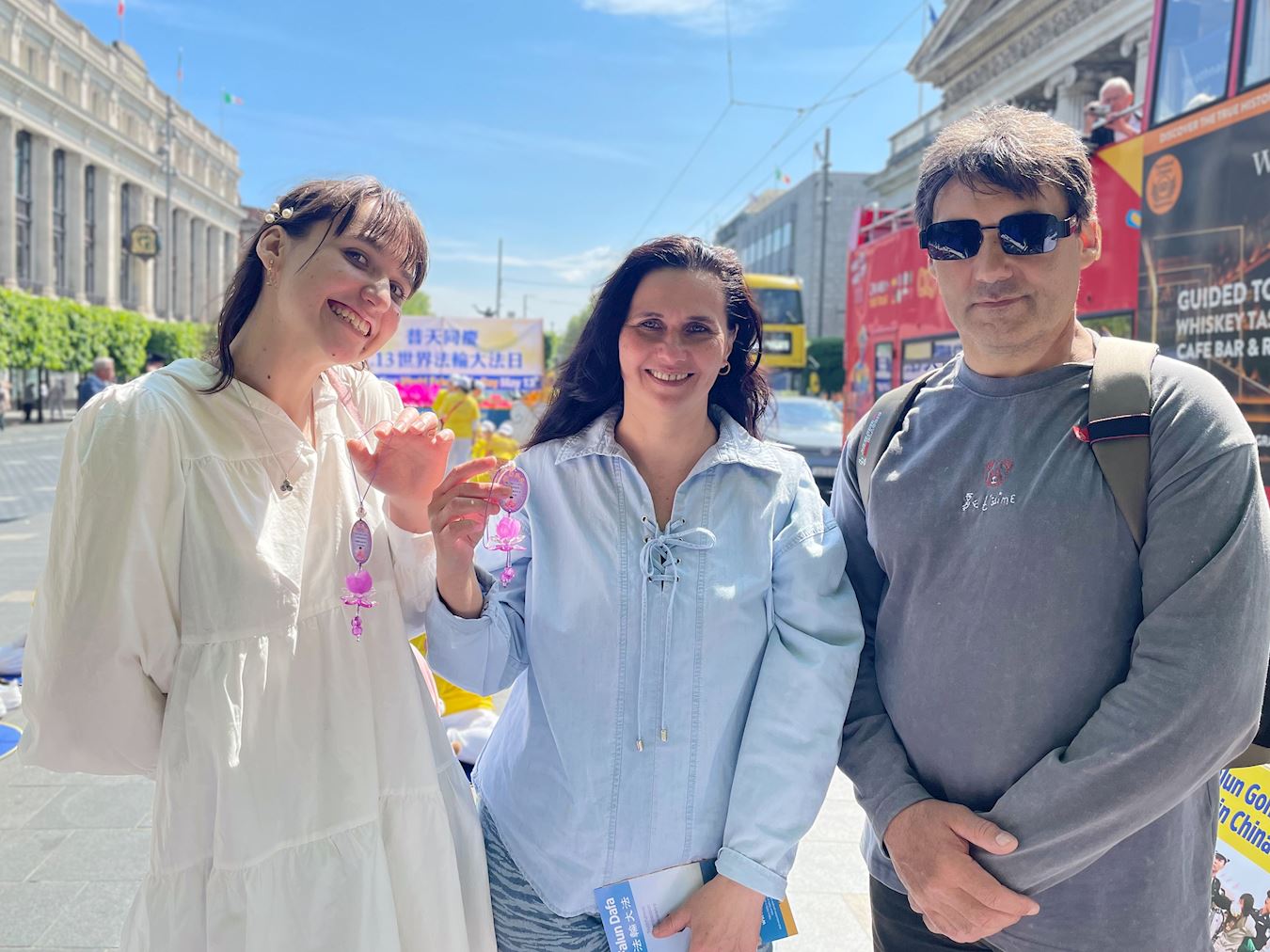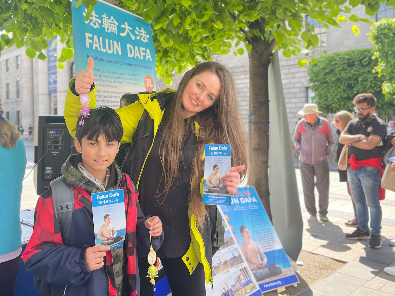 安热莉卡(Anzhelika)看到庆祝大法日的表演,她开心地拉着父母走过来。安热莉卡也是一名法轮功学员,三年前从乌克兰来到爱尔兰西部的一个城市,因为父亲刚搬来都柏林,她周末赶来这里,没想到在这里看到了庆祝大法日的活动。