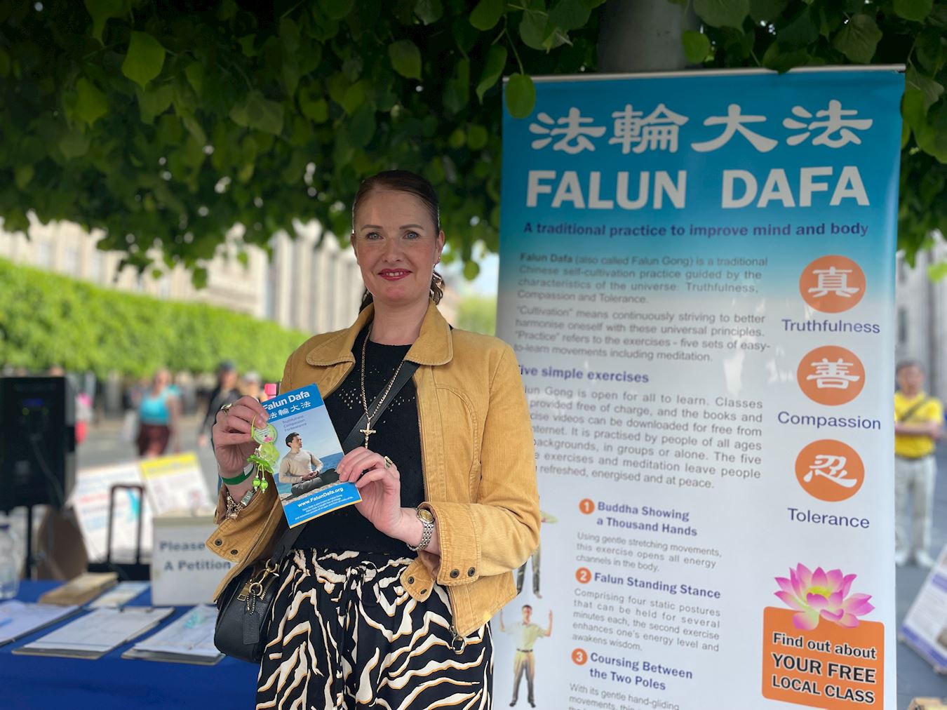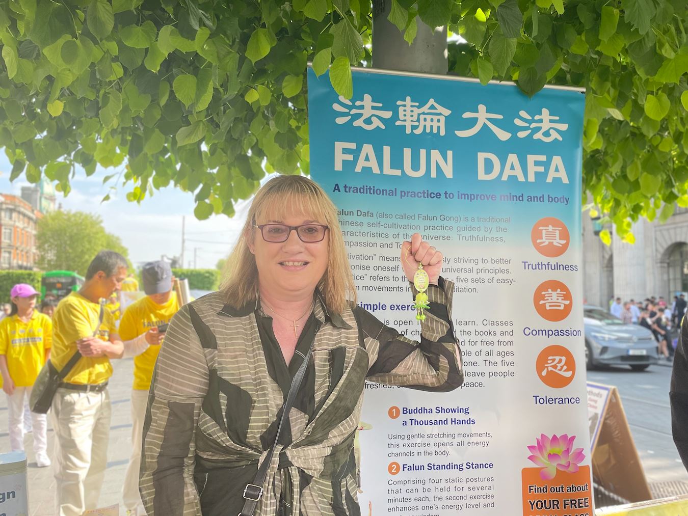 在科技行业工作的伊丽莎白(Elizabeth)是都柏林当地居民。路过集会现场时,看到学员在征签,她立即走过来签名,要求制止中共迫害法轮功。伊丽莎白坦承这是她第一次了解法轮功,不过看到学员集体炼功的场面,她感到了一种“强大的能量场”。