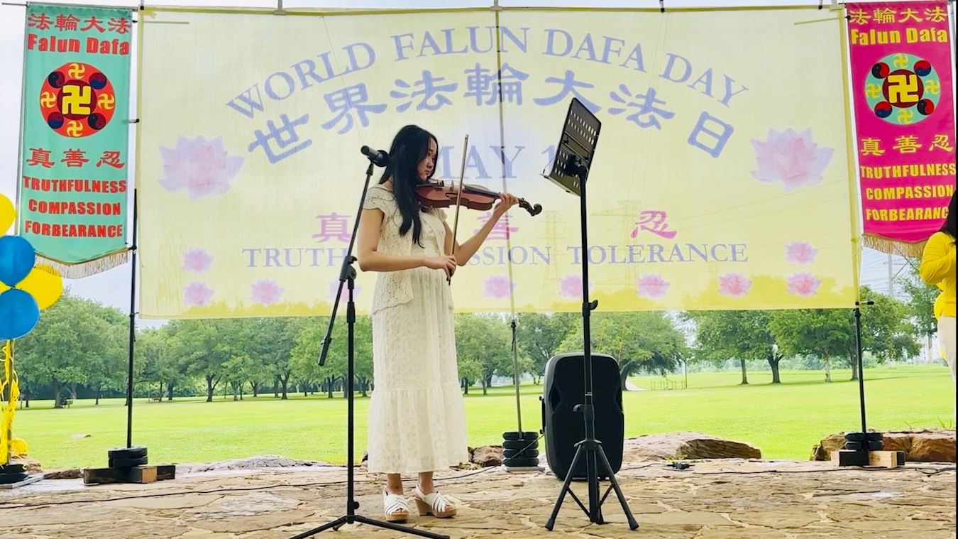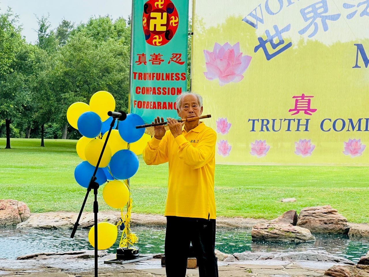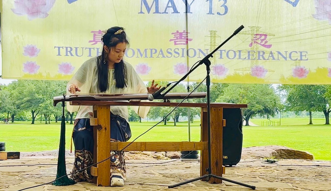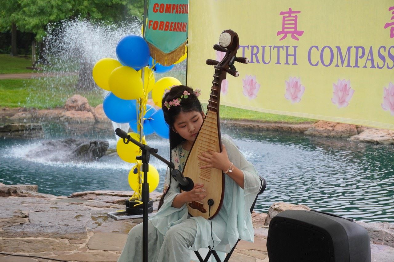 随后的文艺演出以大法小弟子们中英文朗诵《洪吟》中的诗篇拉开帷幕,接下来是合唱《师恩颂》和《得度》、诗歌朗诵。以及琵琶、唢呐、笛子、小提琴、双簧管、古琴独奏等才艺展示,腰鼓队压轴出场。