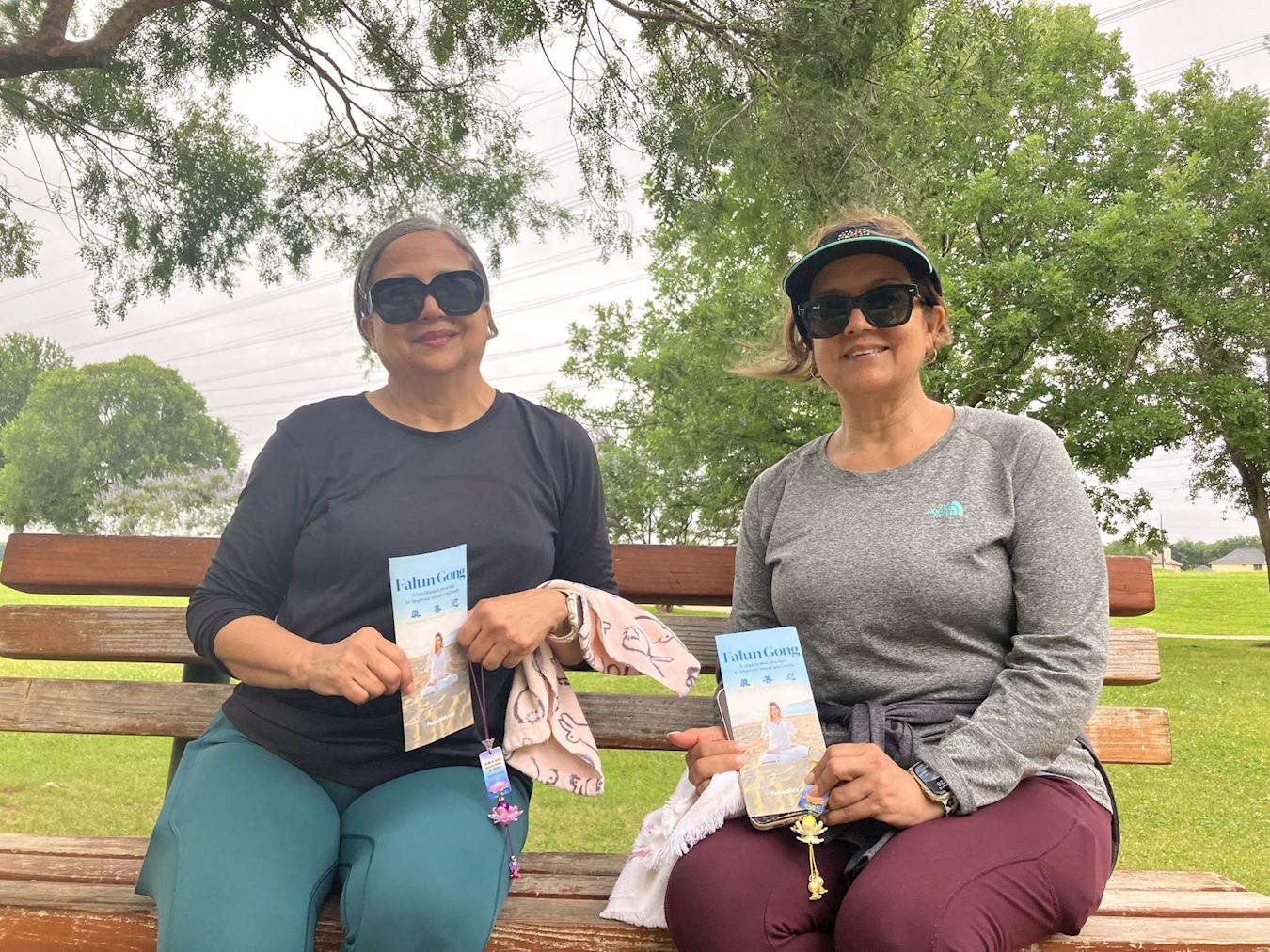 卡梅伦(Carmeron)和露丝(Rose)是一对姐妹,妹妹卡梅伦是本地居民,姐姐露丝来自德州帕德里岛(Padre Island),近日来休斯顿探亲。她们坐在长椅上观看法轮功学员炼功良久,两人都非常欣赏法轮功学员所秉持真、善、忍的价值观。