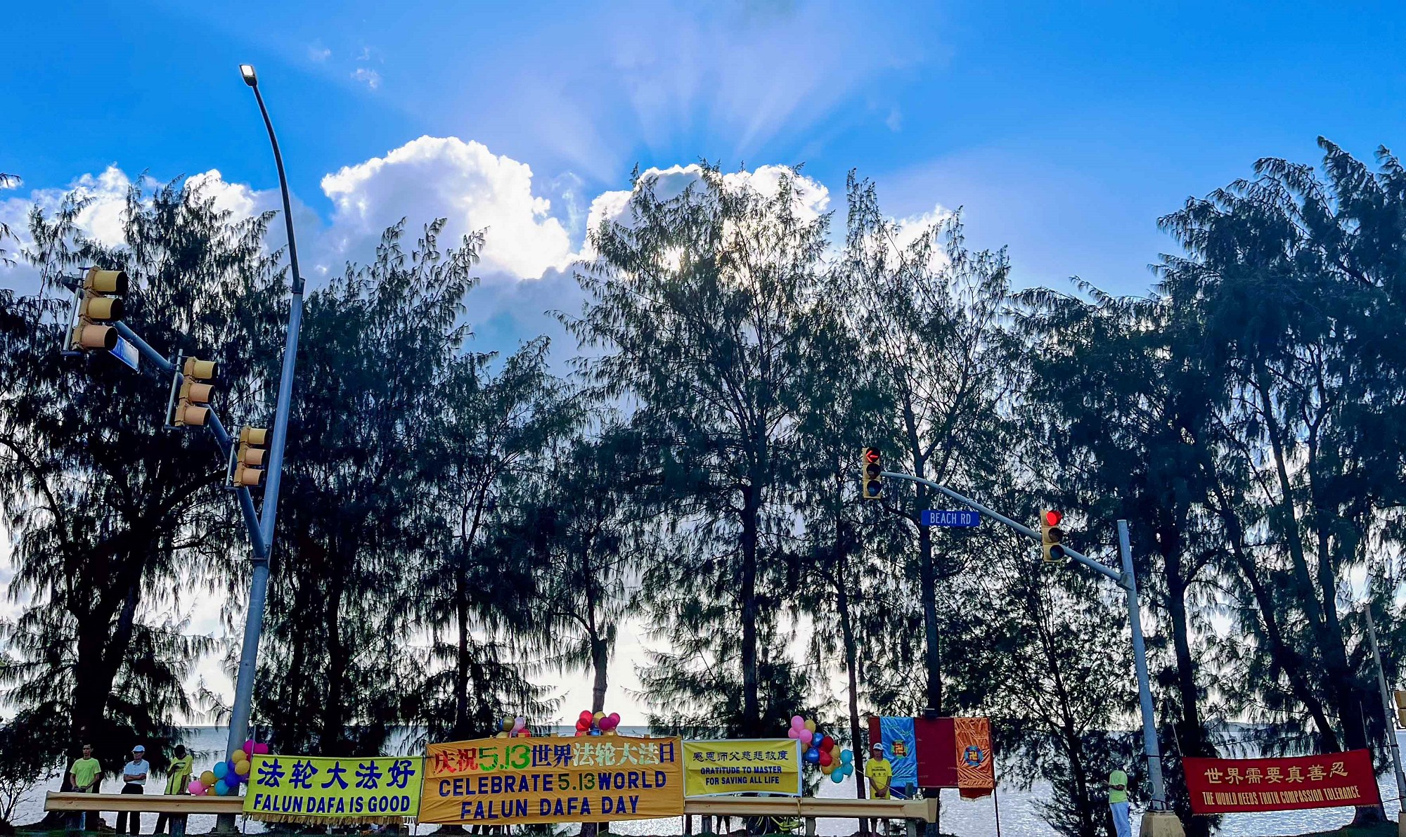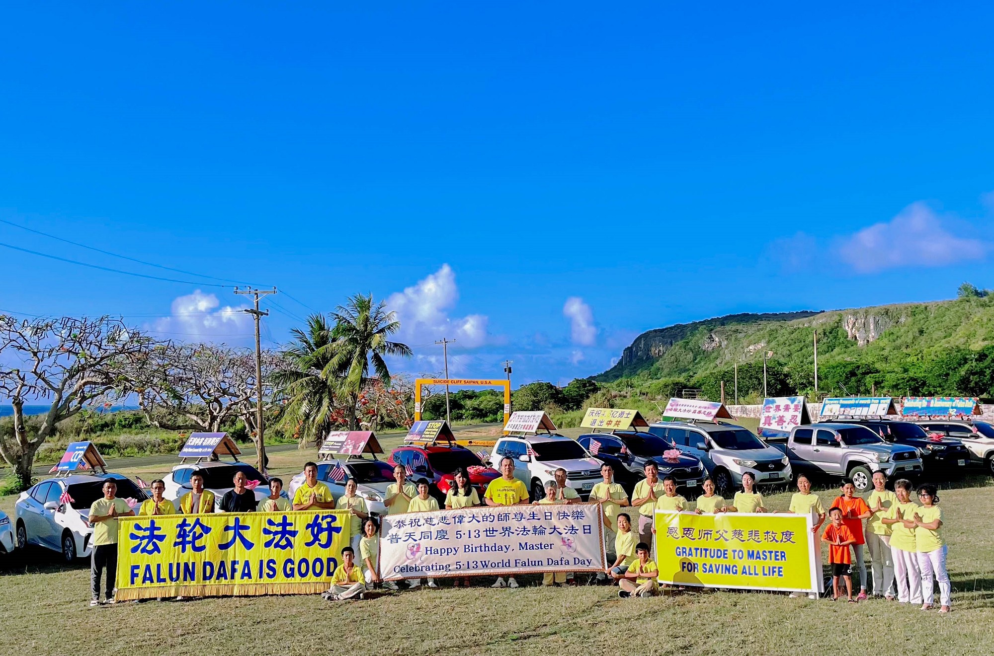 五月十三日,塞班岛当日碧海蓝天,祥云瑞气,学员们从下午三点左右至晚上六点半左右在TOYOTA车行附近的三岔路口的安全地带,举办世界法轮大法日的庆祝活动,展示“法轮大法好”、“庆祝5.13世界法轮大法日”、“感恩师父慈悲救度”、“世界需要真善忍”等横幅向市民传递法轮大法的美好。