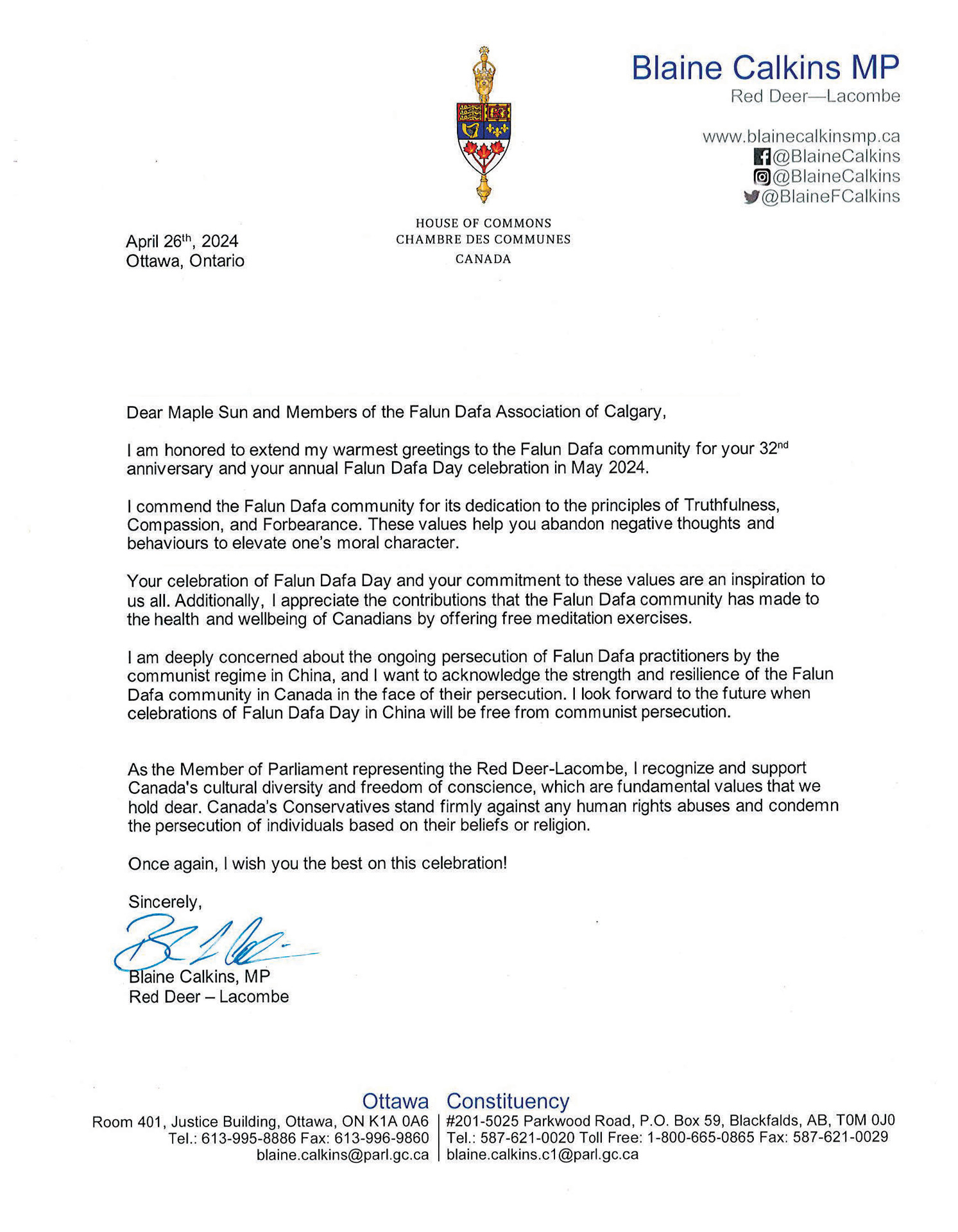 卡尔加里Rocky Ridge选区国会议员、联邦影子内阁部长帕特·凯利(Pat Kelly)表示:“当你们庆祝对加拿大的贡献,弘扬真、善、忍的价值观时,我谨向卡尔加里法轮大法团体致以个人问候!”