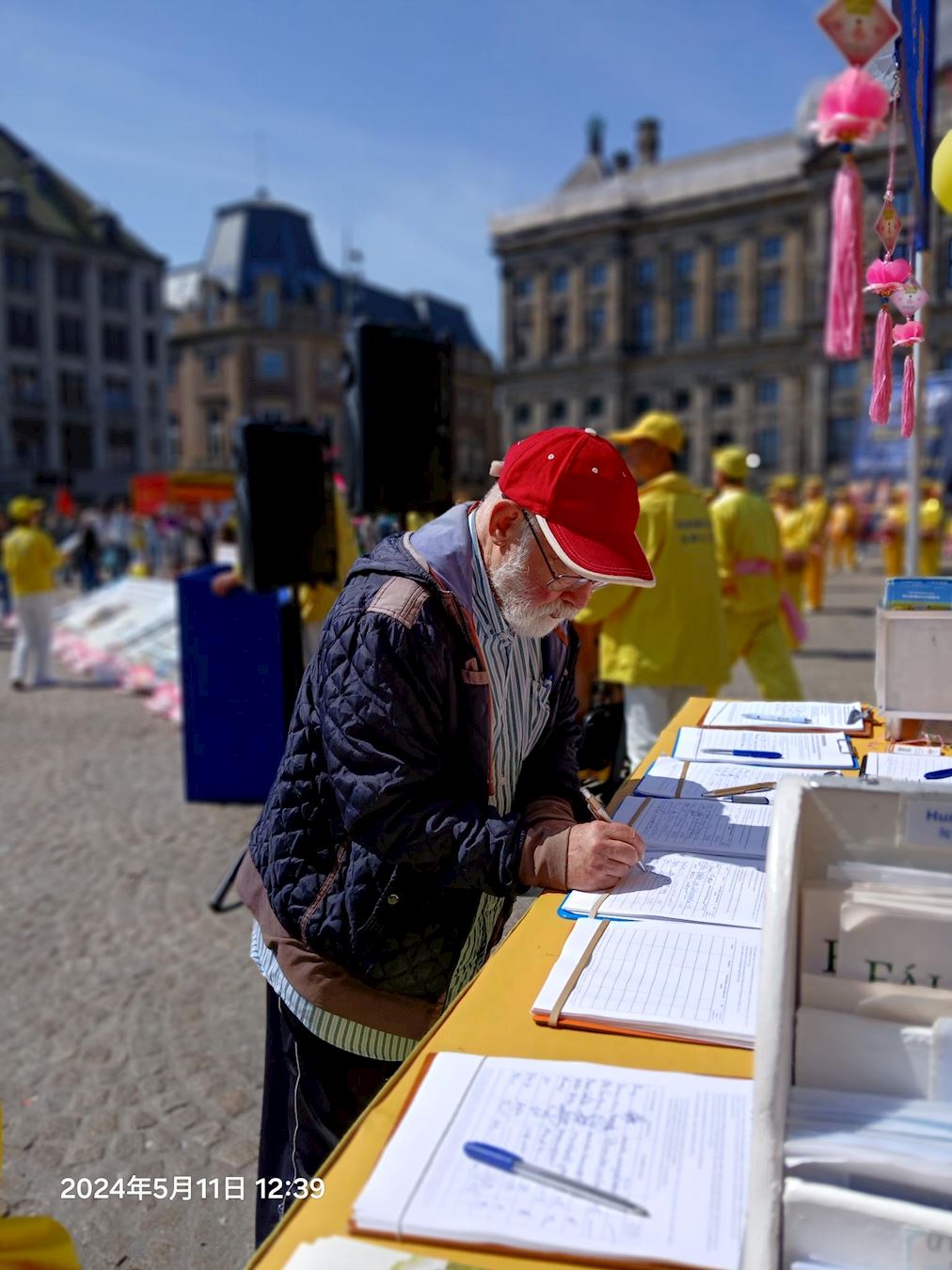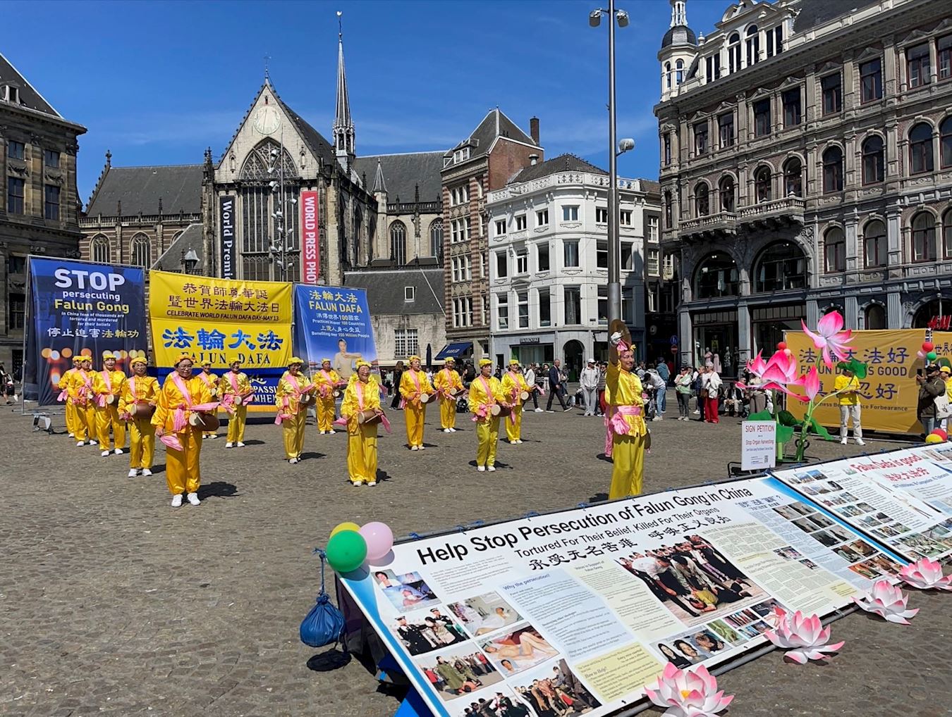 这一天,阳光明媚,天气晴好,部分荷兰法轮功学员早早来到水坝广场,竖起巨大的横幅,向往来游人展示这次活动的重大意义。