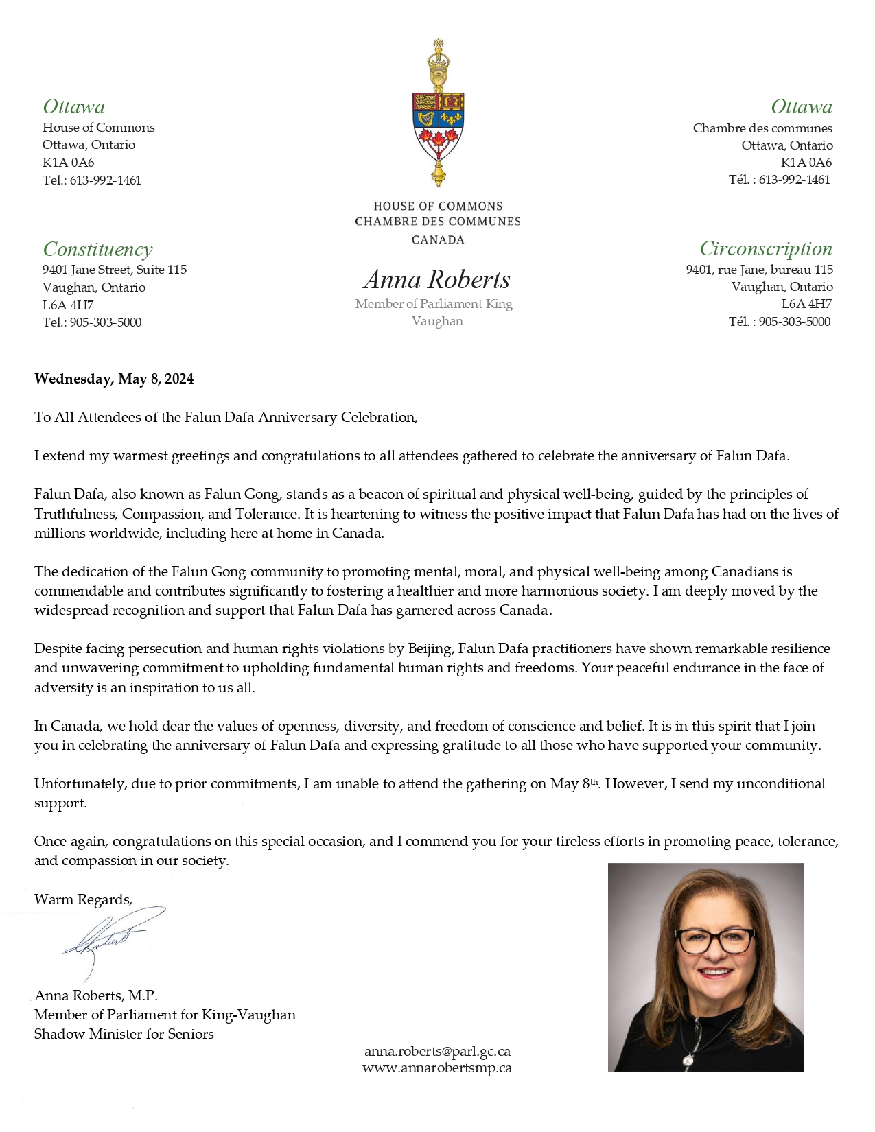【明慧网二零二四年五月二十日】(明慧多伦多记者站报道)二零二四年五月十三日,是法轮大法弘传世界三十二周年暨第二十五届世界法轮大法日。在这个普天同庆的节日即将到来之际,加拿大各省市政要和往年一样,纷纷开始以贺信和视频的形式向这一日子致以热忱的祝贺和赞扬,称颂法轮大法为世界带来的美好与福祉。以下是加拿大十七位政要的祝贺贺信。