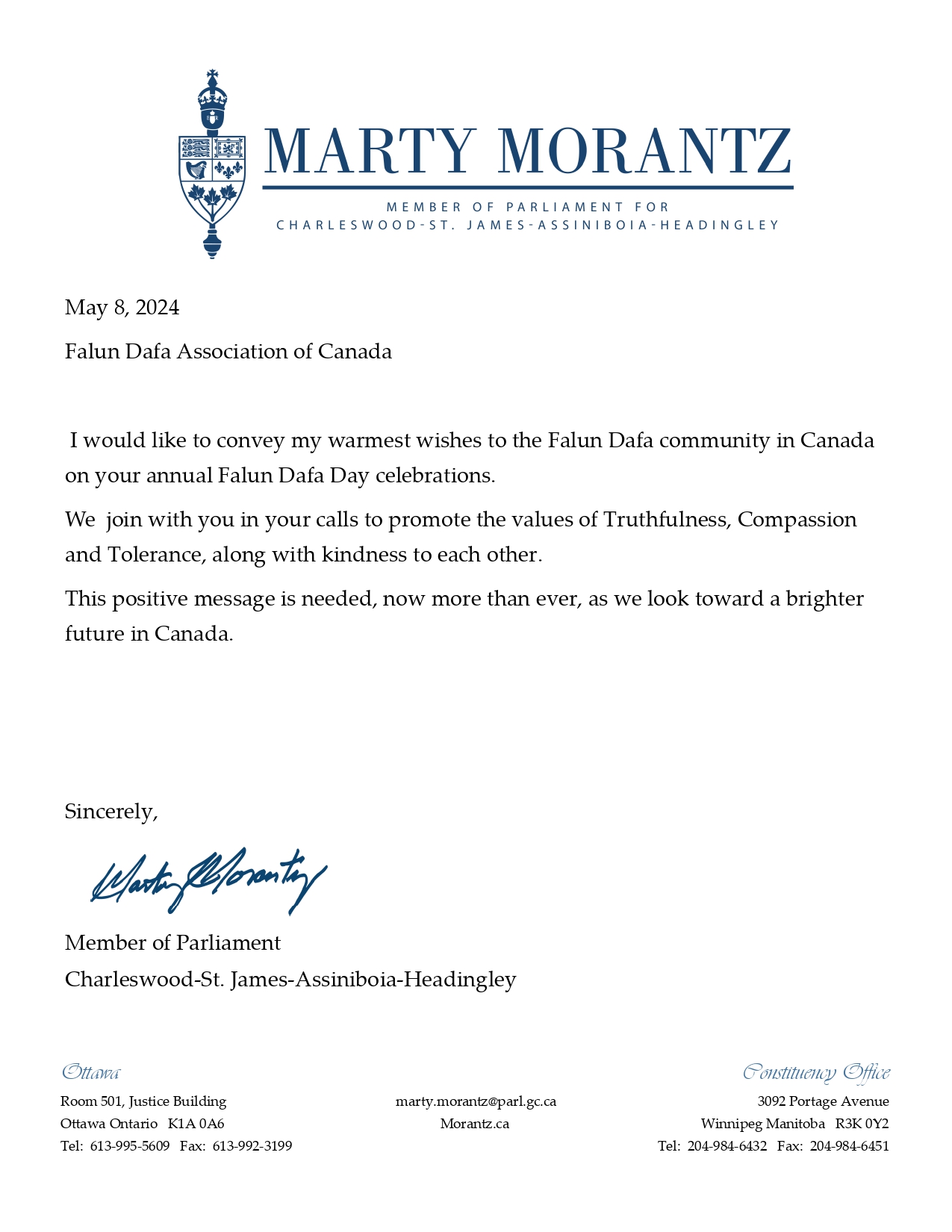 曼尼托巴省国会议员马蒂·莫兰兹在贺信中说:在你们的法轮大法日年度庆祝活动之际,我想向加拿大法轮大法协会致以最诚挚的祝愿。