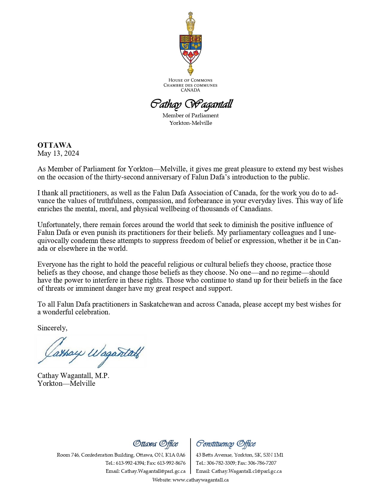 萨斯喀彻温省国会议员瓦甘托在贺信中说:作为约克顿-梅尔维尔、选区的国会议员,我很高兴在法轮大法弘传三十二周年之际向你们致以最美好的祝愿。