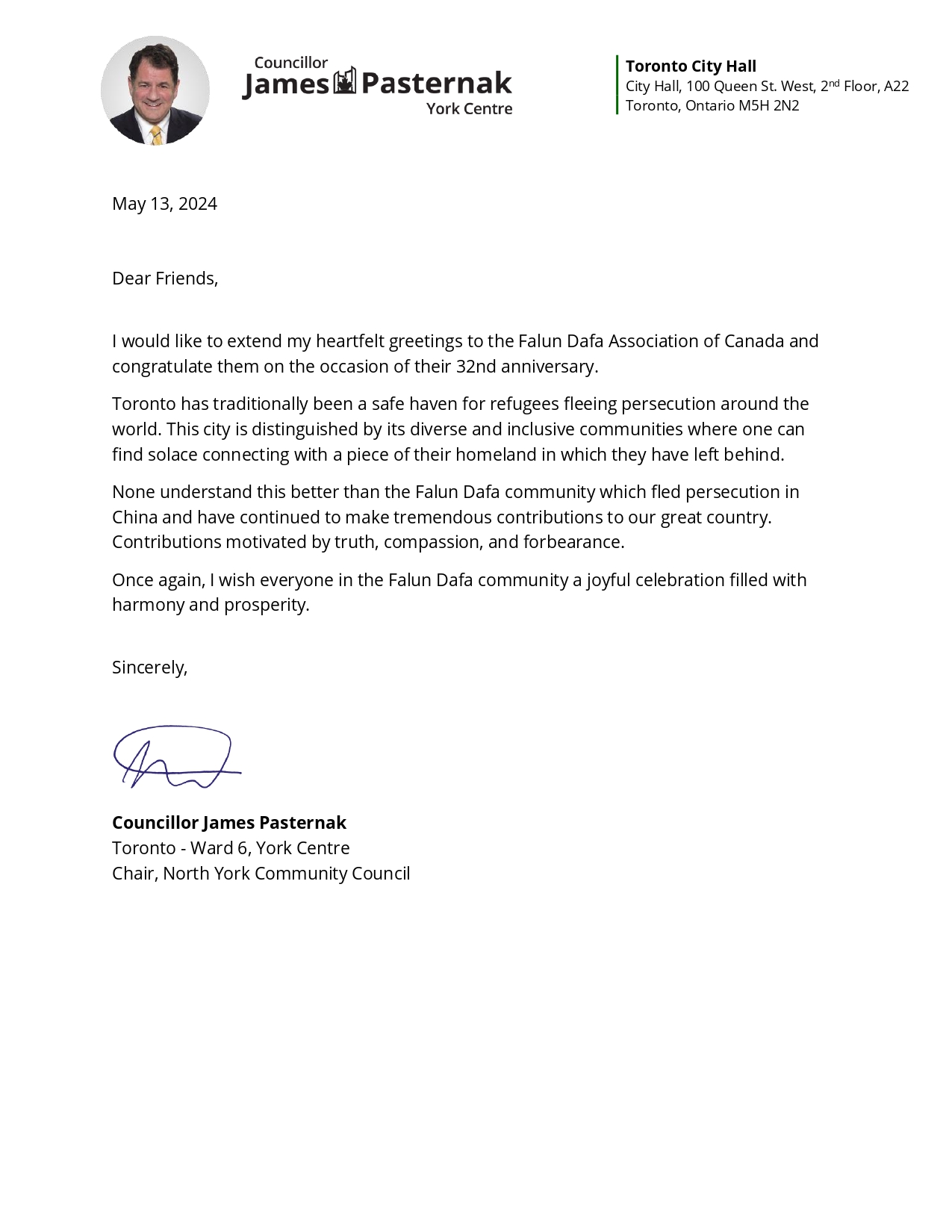 多伦多市第六选区约克中心市议员兼北约克社区委员会主席詹姆斯·帕斯特纳克在贺信中说:值此加拿大法轮大法协会庆祝法轮大法洪传三十二周年之际,我谨此表示衷心的问候和祝贺。