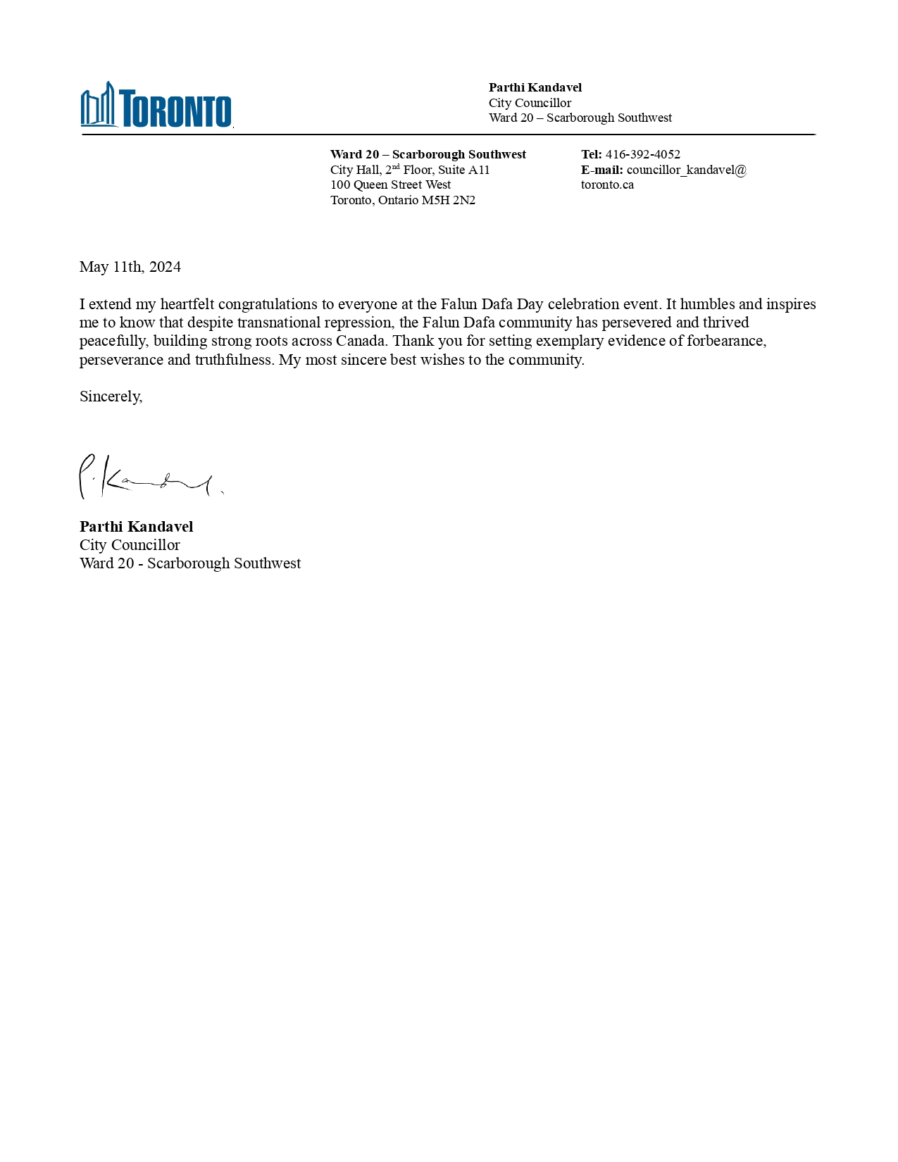 第20选区-士嘉堡西南市议员帕蒂·坎达维尔在贺信中说:我向法轮大法日庆祝活动的所有人致以最诚挚的祝贺。当了解到尽管受到跨国打压,法轮大法社区仍然坚韧不拔、和平发展、在加拿大各地扎根之后,我佩服并深受鼓舞。感谢你们树立了忍耐、坚韧和真诚的典范。向法轮大法学员致以我最真诚的祝愿。