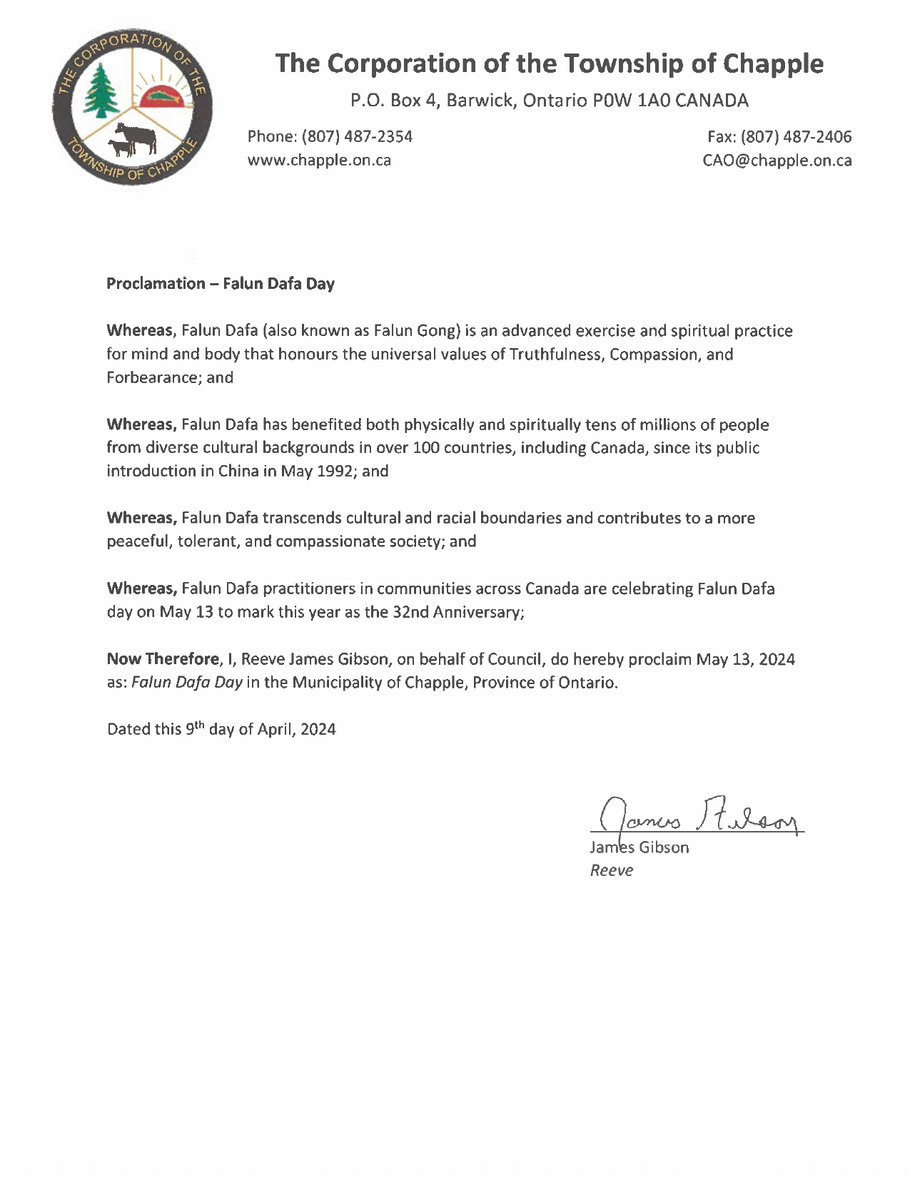 因此,镇长詹姆斯·吉布森代表市议会,特此宣布二零二四年五月十三日为安大略省查普尔镇法轮大法日。